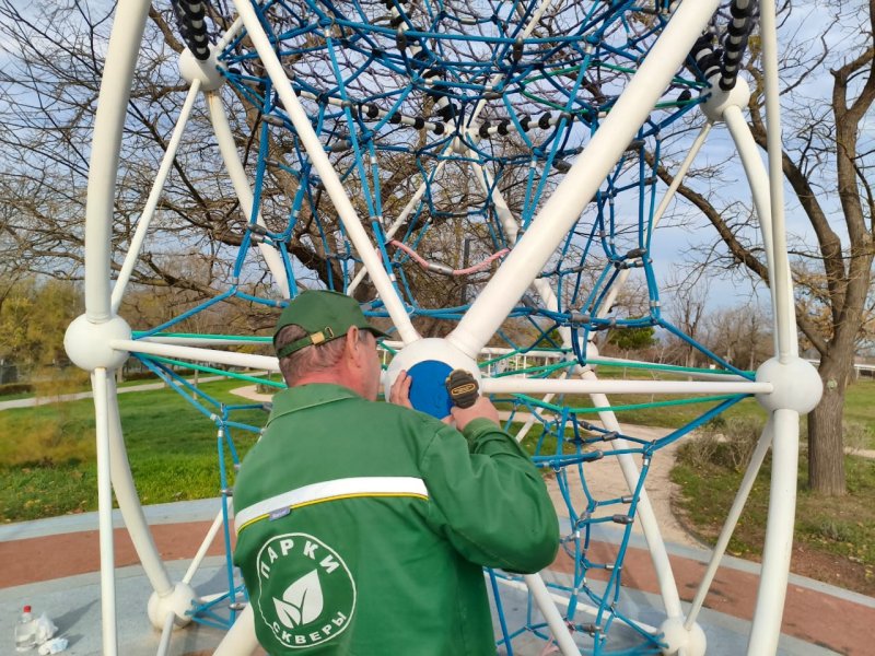 В Севастополе специалисты предприятия «Парки и скверы» отремонтировали качели, тренажёр и карусель, а также отчистили граффити на детской площадке в парке Учкуевки