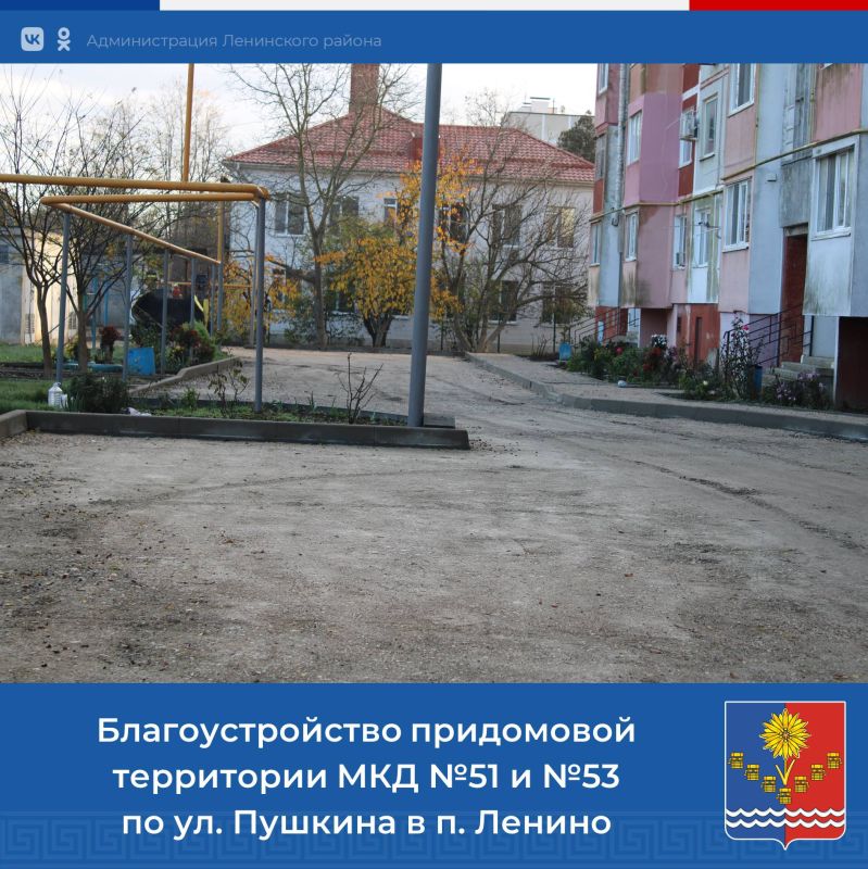 В рамках исполнения поручения Главы Республики Крым Сергея Аксенова глава администрации поселка Олег Касьянов и начальник управления ЖКХ Администрации района Александр Колесников посетили дворовую территорию МКД, расположенного по адресу: улица Пушкина, дом 51 и 53, в поселке Ленино. На объекте уже на завершающем этапе проводятся работы по благоустройству дворовой территории.