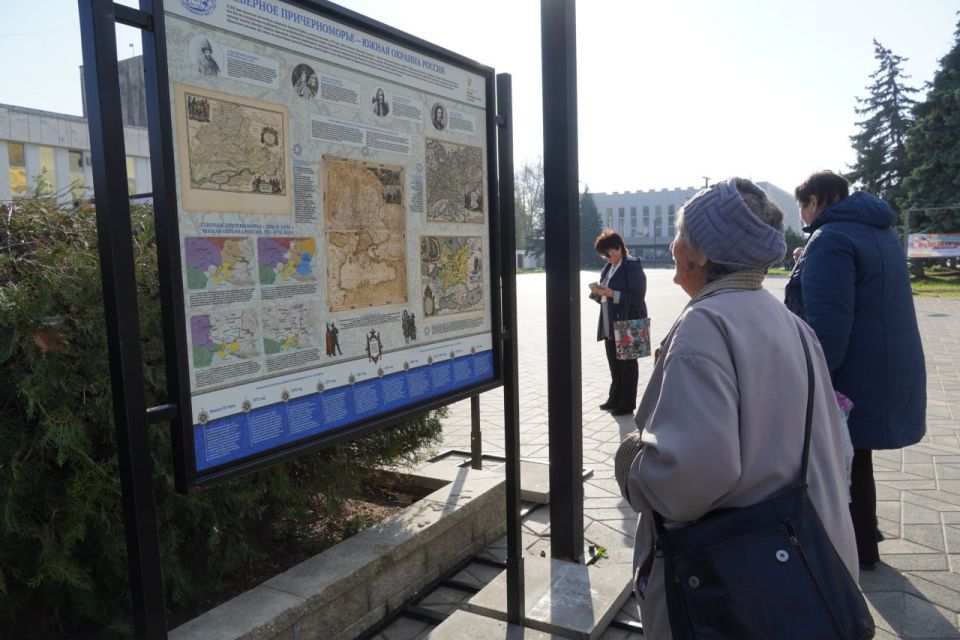 Экспозицию торжественно открыли на площади перед Дворцом культуры «Корабел». Она создана на основе материалов из архивов, картографического фонда и библиотеки РГО, несет важную просветительскую и объединяющую миссию, способствует формированию объективного патриотического мнения и позитивного отношения к истории воссоединения России, Крыма и Новороссии на основе проверенных исторических материалов.