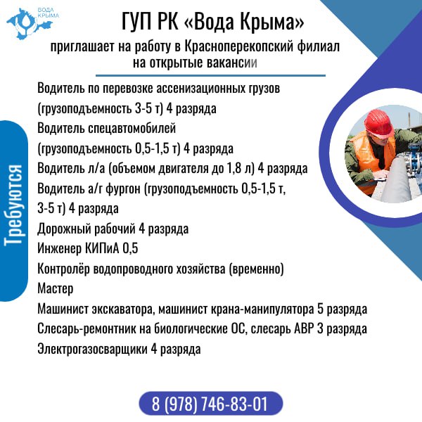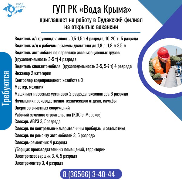 ГУП РК «Вода Крыма» приглашает на постоянную работу!