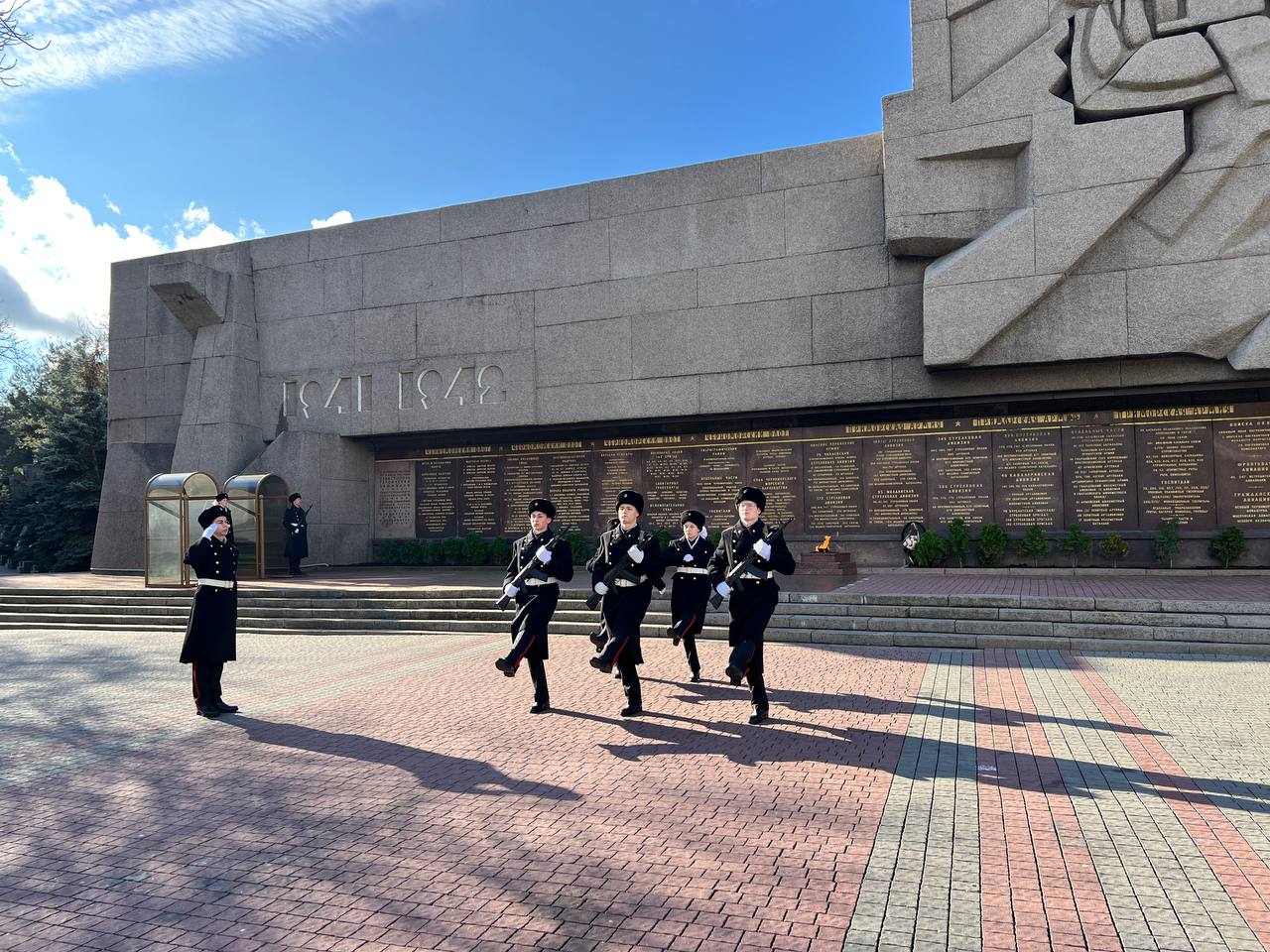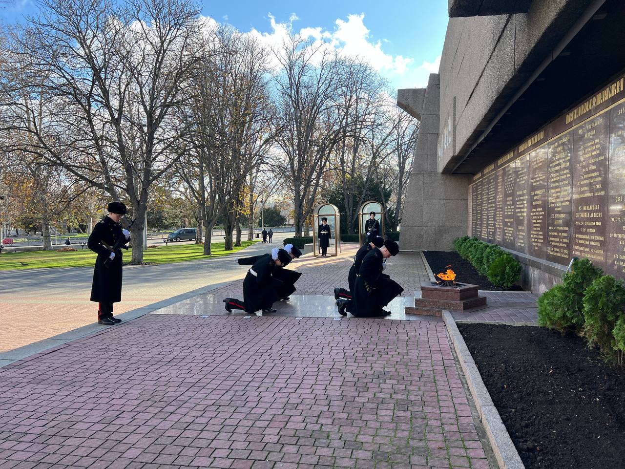 Кадеты прошли к Мемориалу героической обороны Севастополя 1941-42 гг. через площадь Нахимова, аллею Городов-Героев и приклонили колено перед Вечным огнём.