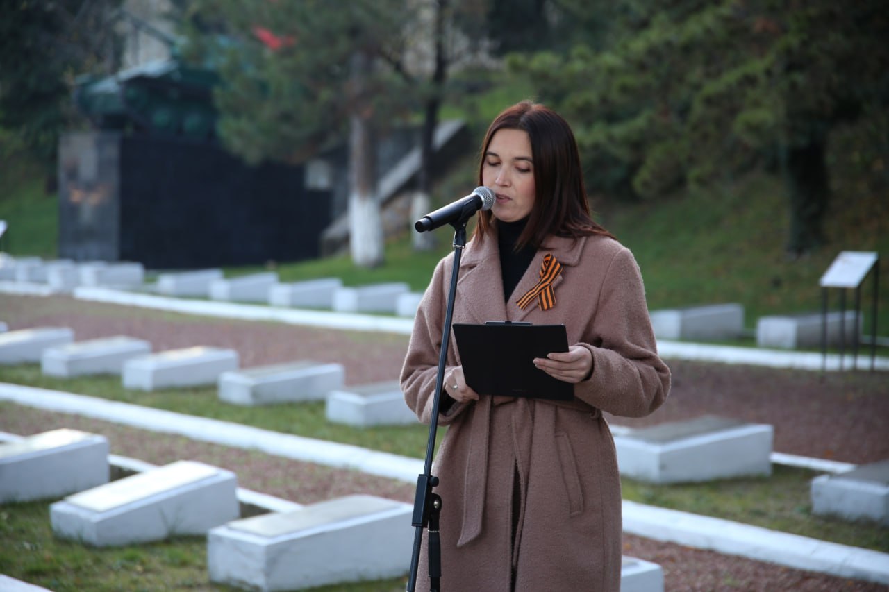 Собравшиеся почтили память погибших, всех тех, кто не вернулся с войны и чьи имена остались неизвестными, объявив минуту молчания и возложив цветы к могиле неизвестного солдата.