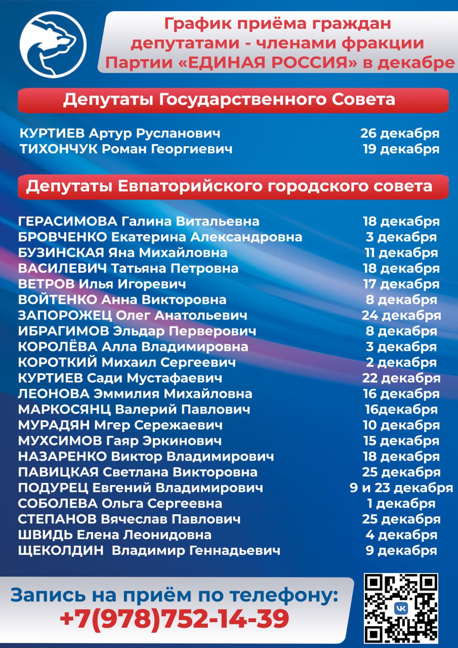 График приема граждан депутатов Государственного Совета Республики Крым и Евпаторийского городского совета в декабре 2025 года.