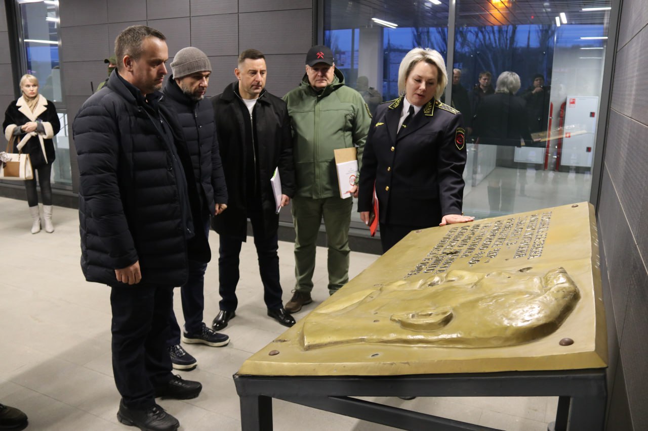 На входе в вокзал министру продемонстрировали единственное, что уцелело от фасада прежнего здания вокзала - мемориальную доску, посвященную разведчику черноморского флота мичману Е.В. Павлову, участнику морского десанта, освободившего Мариуполь в годы Великой Отечественной войны.