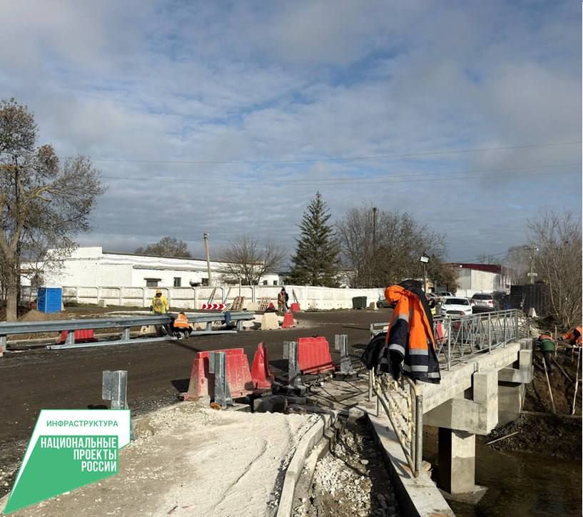 В настоящее время ведутся работы по установке и покраске перильного и барьерного ограждения. Были проведены работы по гидроизоляции, вязке переходной плиты для сопряжения моста с насыпью, выравниванию подферменных площадок для установки плит, смонтировано тело опоры, уложено асфальтовое дорожное покрытие.
