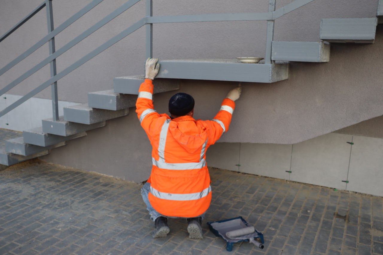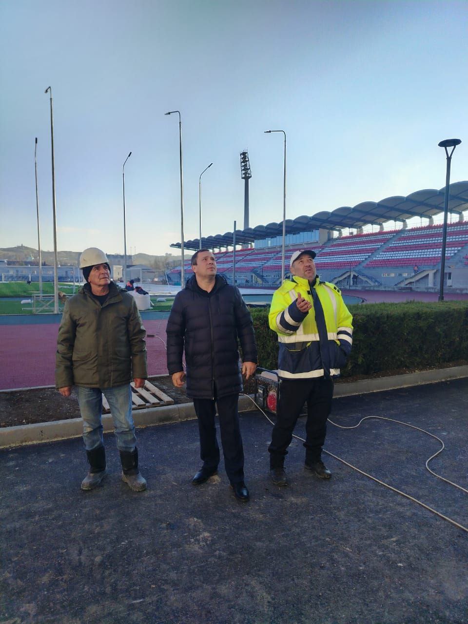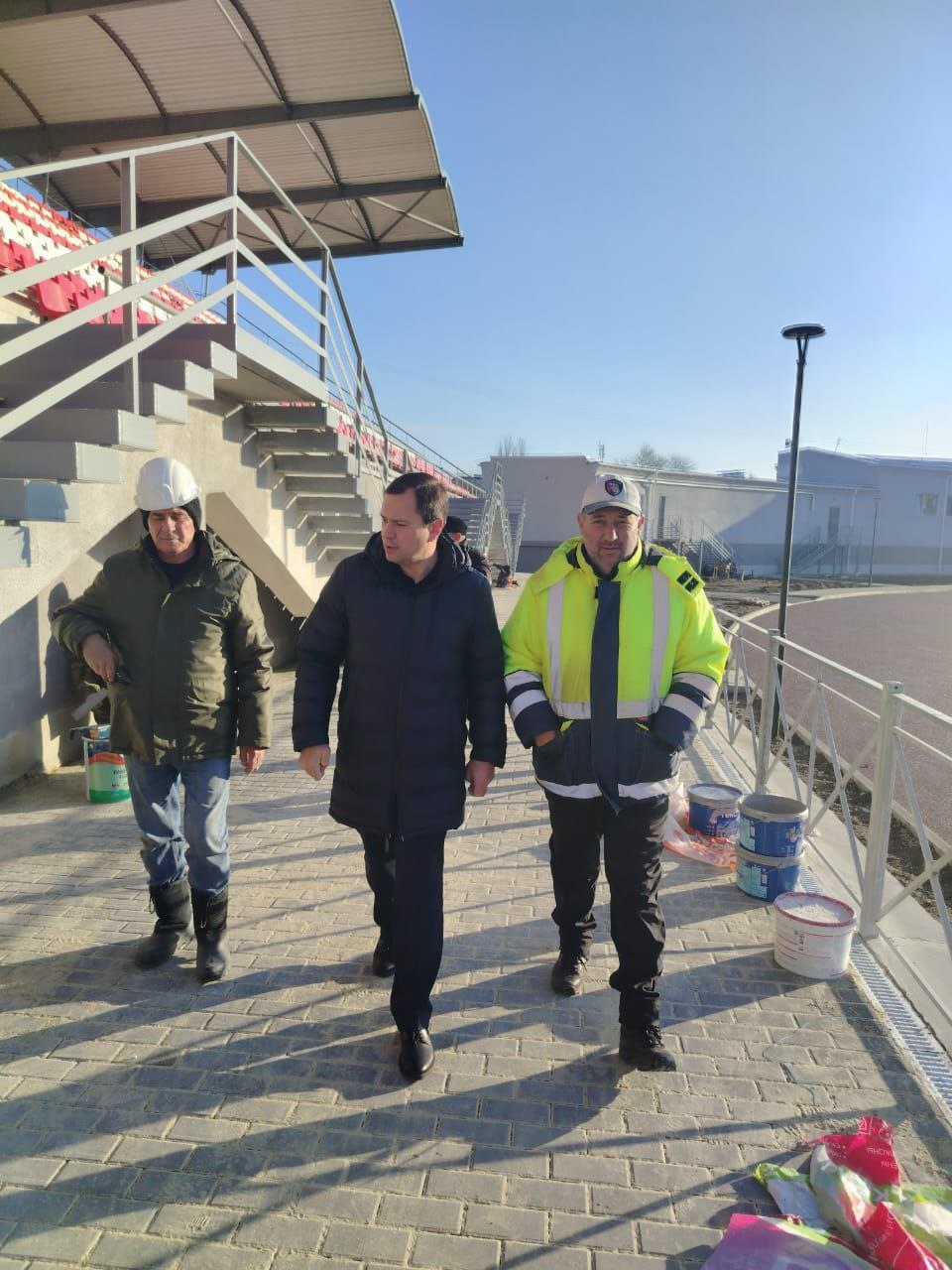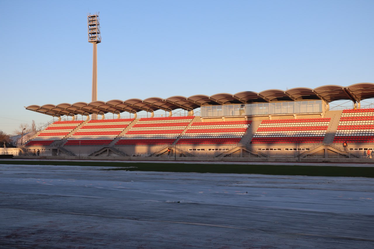 Параллельно производится покраска косоуров, металлических конструкций, фасадов трибун, осветительных мачт с установкой на них прожекторов. Основания трибун облицовывают плиткой из керамогранита.Вдоль них уже выполнено мощение пешеходных зон. На главном здании специалисты заняты обшивкой электронного табло.