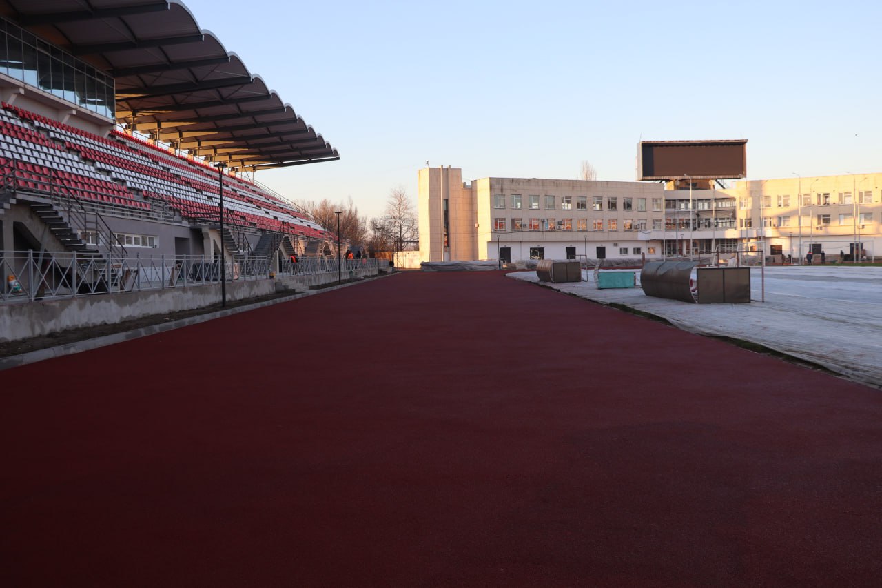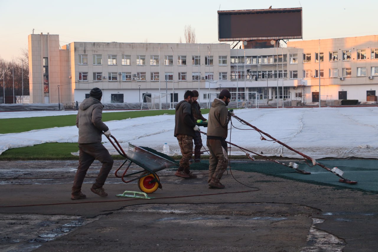 В активной фазе работа по обустройству резинового покрытия беговых дорожек. Основание готово, строители ведут укладку финишного защитного слоя.