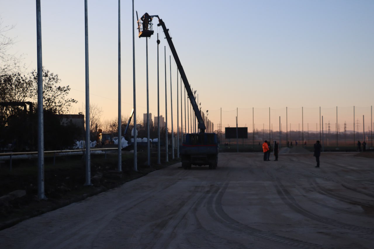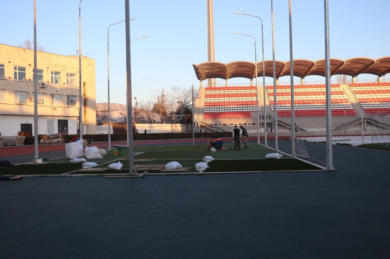 Ведется укладка искусственной травы на новом поле для мини-футбола. На другом - размером 104 на 64 метра продолжается выравнивание основания и монтаж освещения.