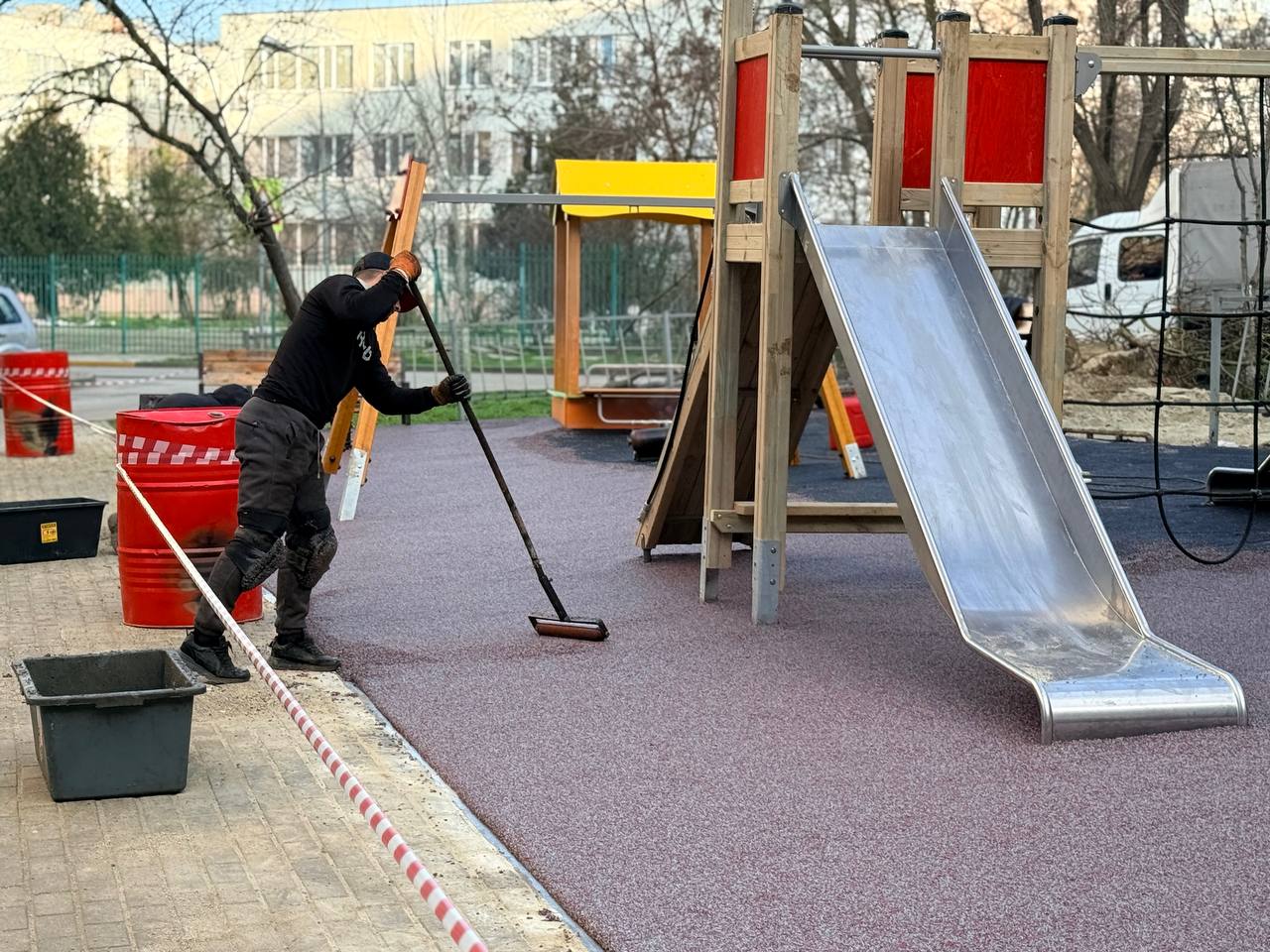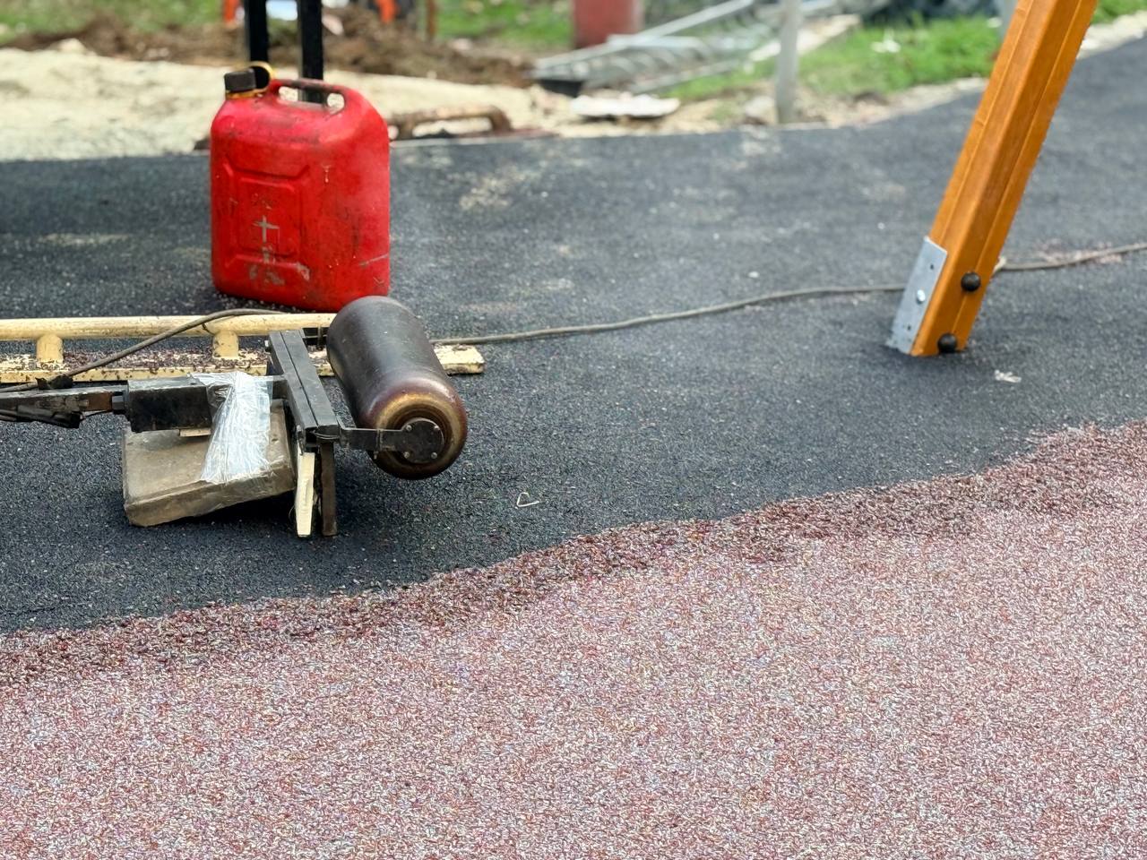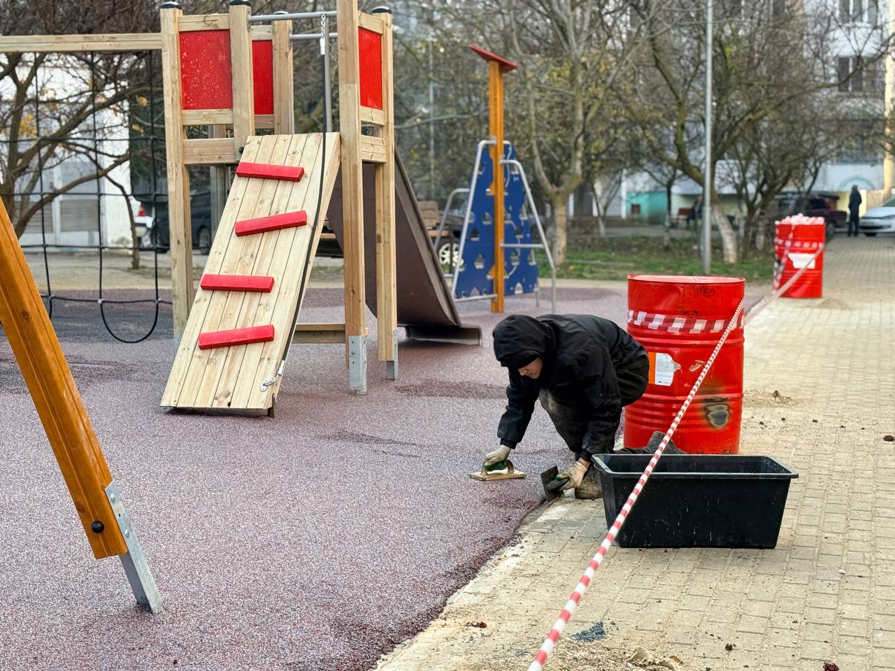 Детская площадка на ул. Кирова, 119 кардинально преобразилась. Строители завершают укладку финишного слоя резинового покрытия.