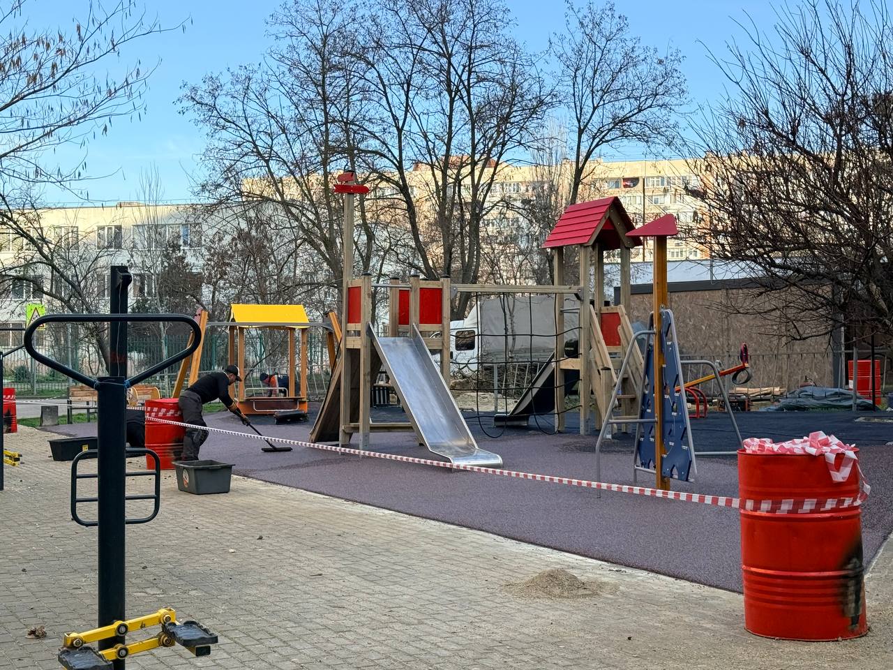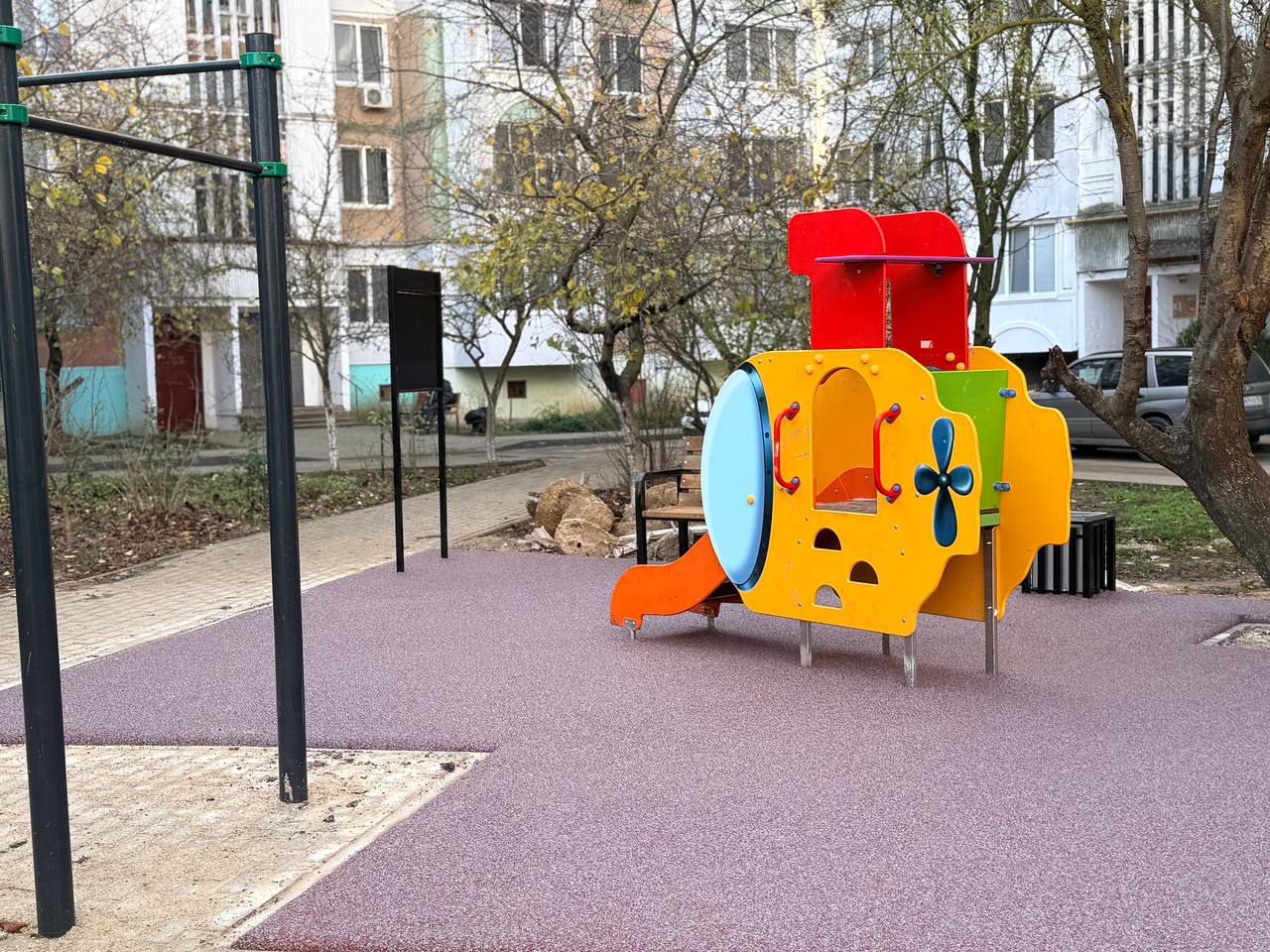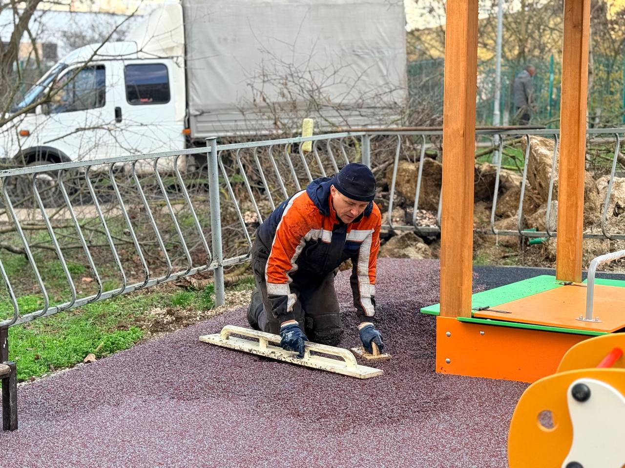 Ранее подрядчики демонтировали старое оборудование, установили поребрики, подготовили основание и уложили новое покрытие. На площадке смонтированы игровые комплексы для детей разных возрастов: качели, балансир и песочница. Установлены фонари для уличного освещения, скамейки и урны.