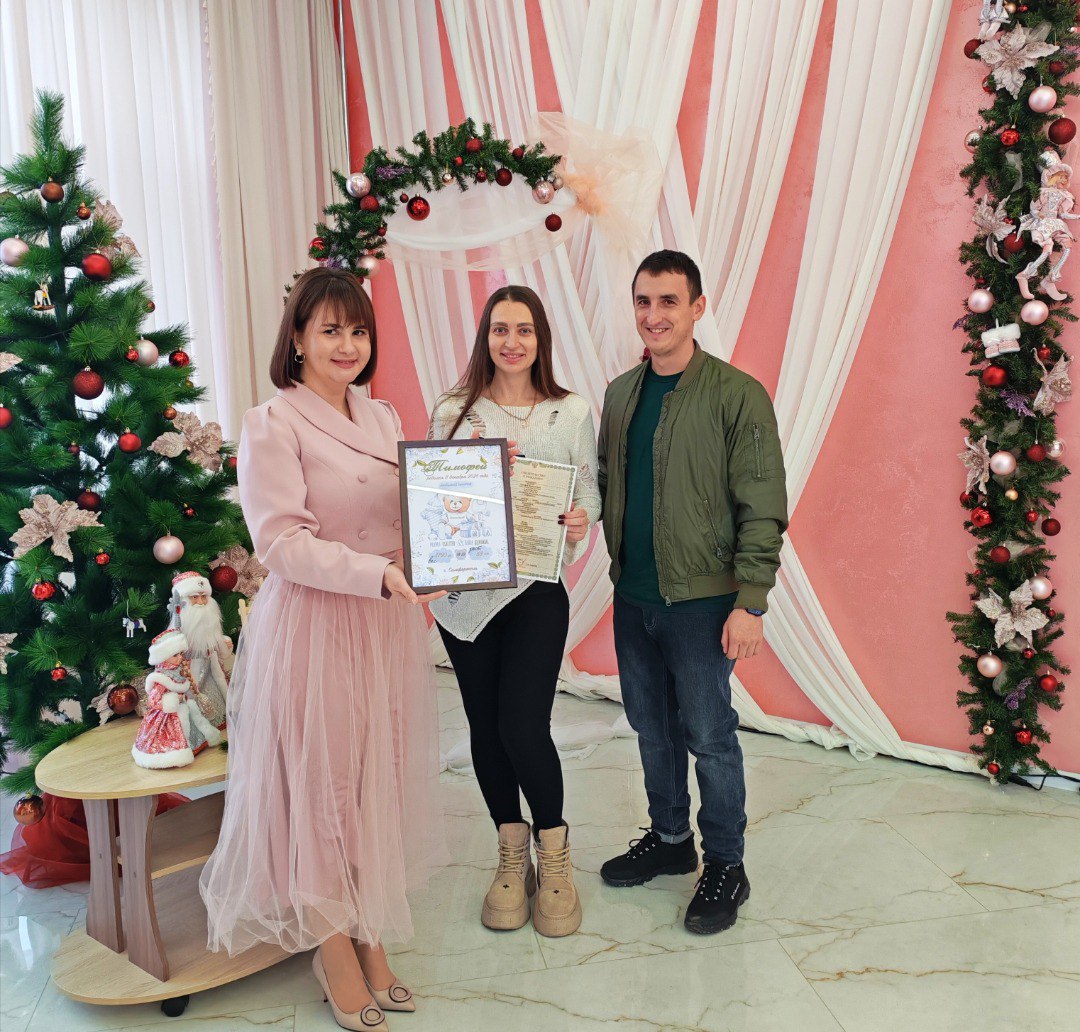 В ходе церемонии сотрудники отдела ЗАГС поздравили родителей с рождением сына, вручив им свидетельство о рождении и памятную метрику.