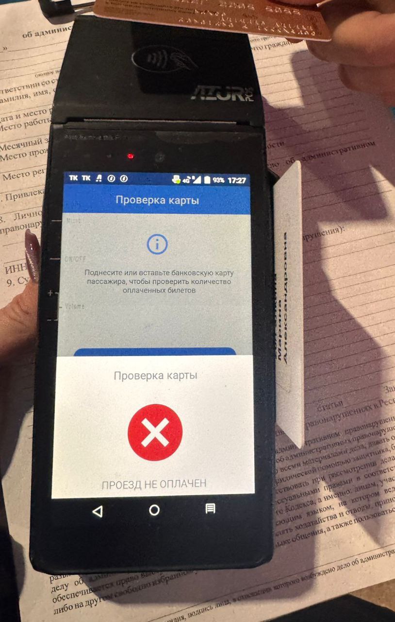 Пассажир самостоятельно прикладывает банковскую карту к терминалу Администрации.