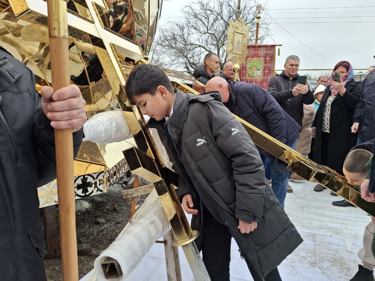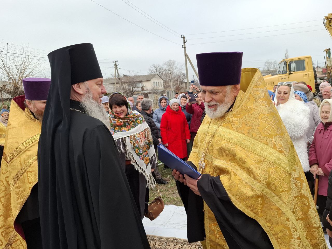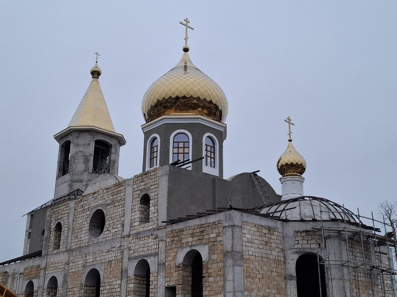 По завершении чина освящения, купола были подняты на строящийся храм с помощью строительной техники и установлены, символизируя торжественный этап в строительстве святыни, которая станет важным духовным центром для местных жителей.