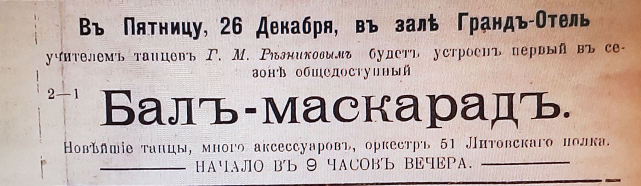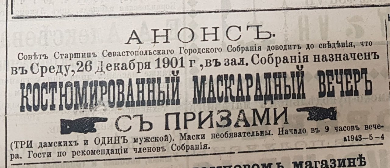 В преддверии Нового года устраивались балы-маскарады. В Симферополе маскарады проходили в гостинице "Гранд-отель" (сейчас на ее месте - Республиканский музыкальный драмтеатр), в Севастополе - в зале Городского собрания, а в Ялте - в курзале.