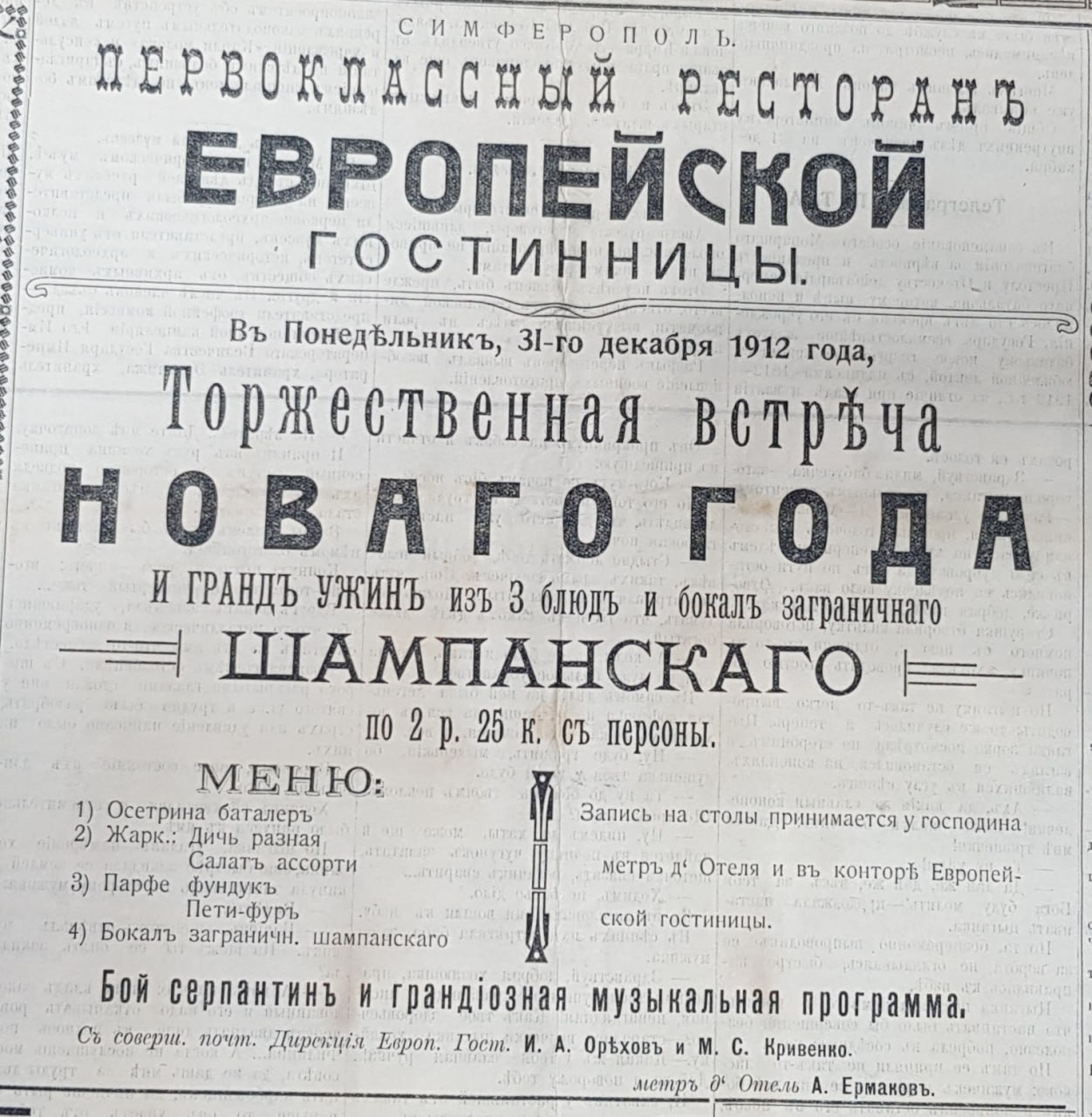 В ночь на 31 декабря лучший праздничный ужин и музыкальный вечер в Таврической губернии устраивался в симферопольской гостинице "Европейская" (ныне - территория сквера 200-летия Симферополя).