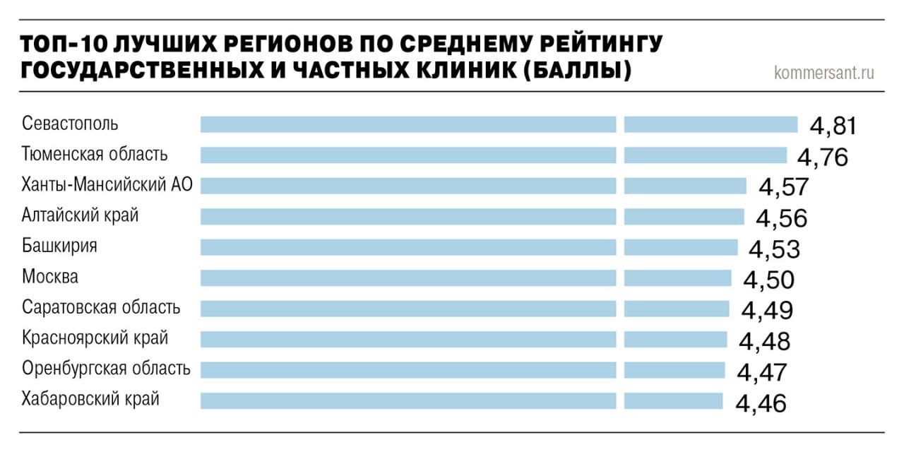 Средняя оценка госклиник за год составила 3,8 из 5 баллов (где 1 — «ужасно», 5 — «отлично»). Частные медучреждения получили более высокий рейтинг — 4,78. Общая оценка удовлетворенности российских пациентов медучреждениями в стране — 4,3.