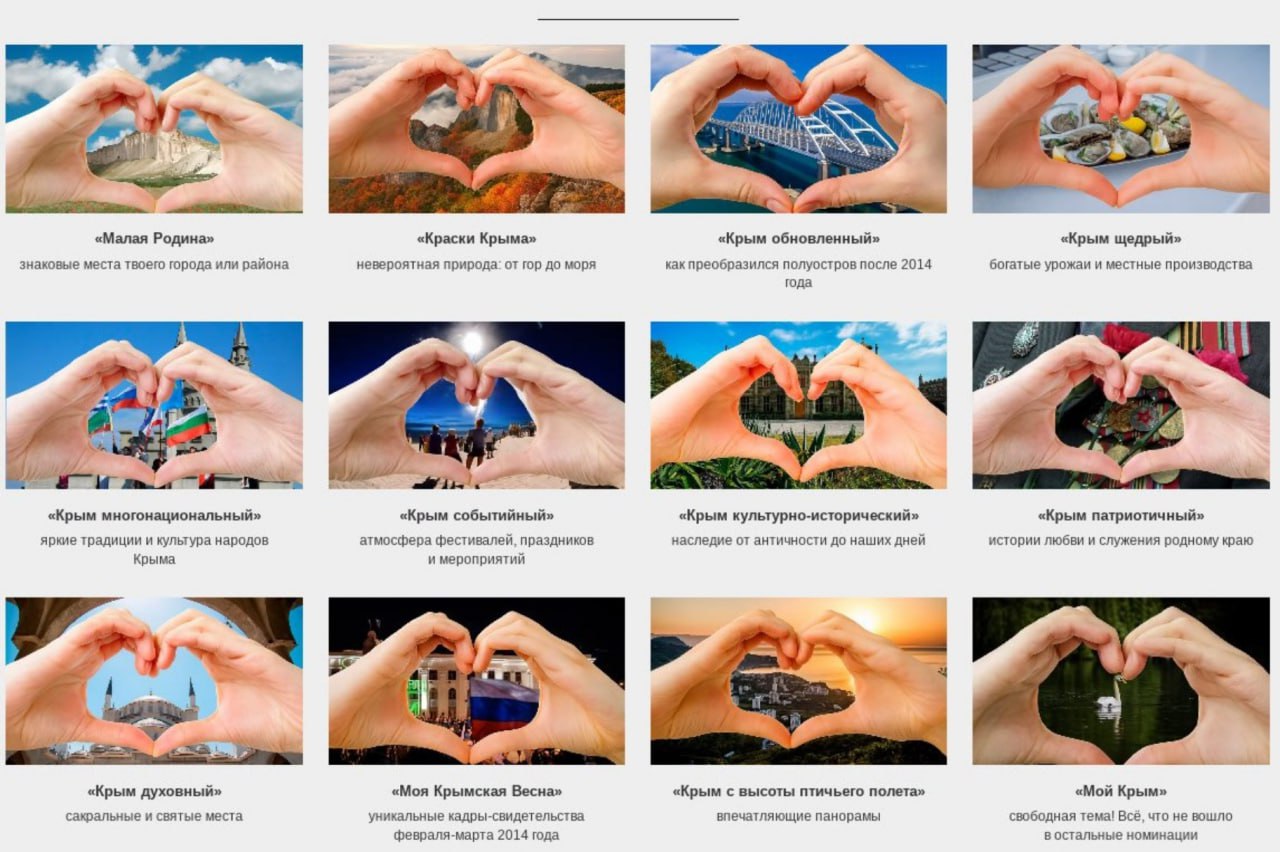 На конкурс поступило 458 фоторабот. Работы подали в 12 номинаций. Наибольшее количество фотографий зарегистрировано в номинациях «Краски Крыма», «Мой Крым», «Крым обновлённый», а также в номинации «Крым с высоты птичьего полёта».