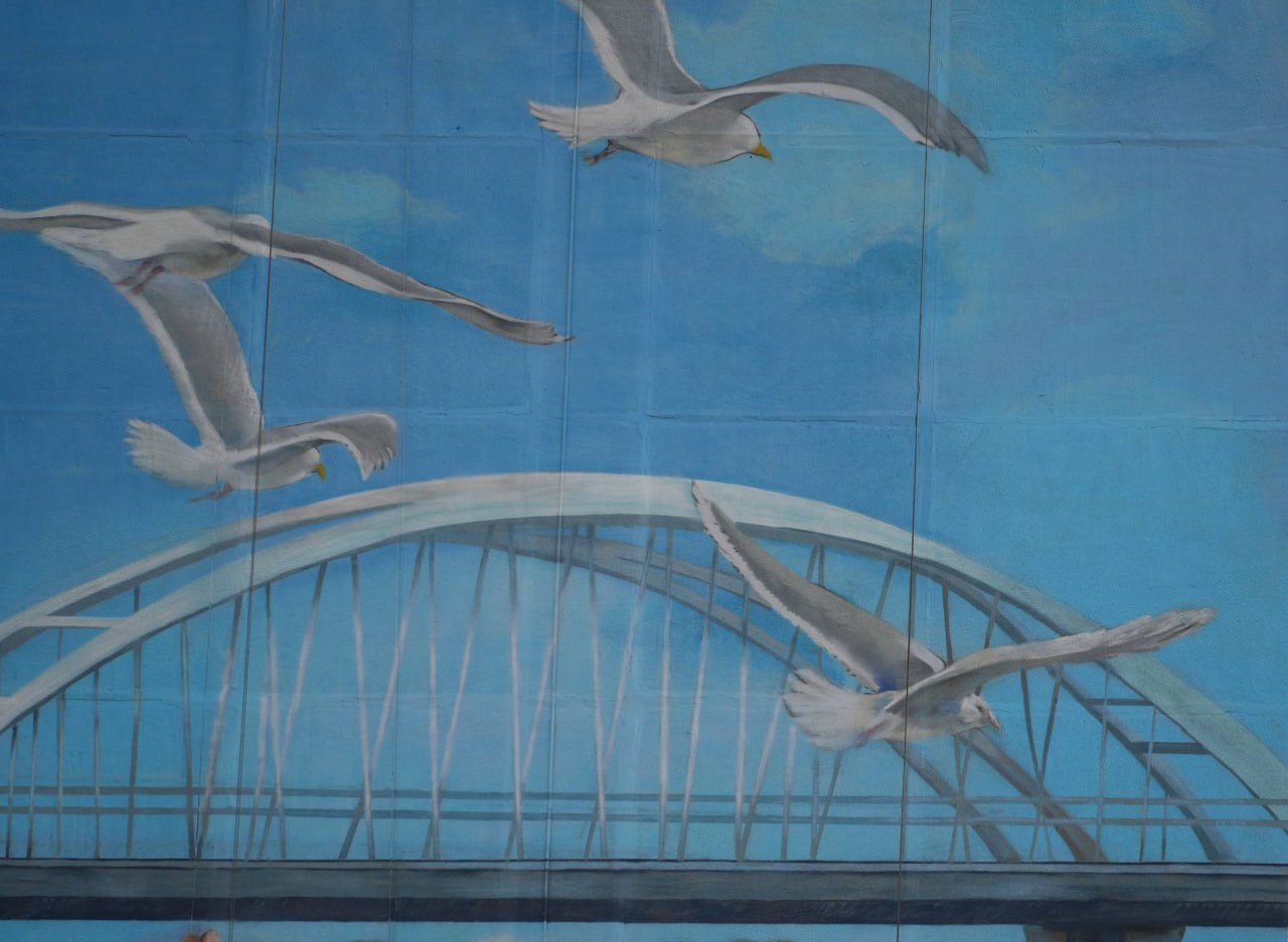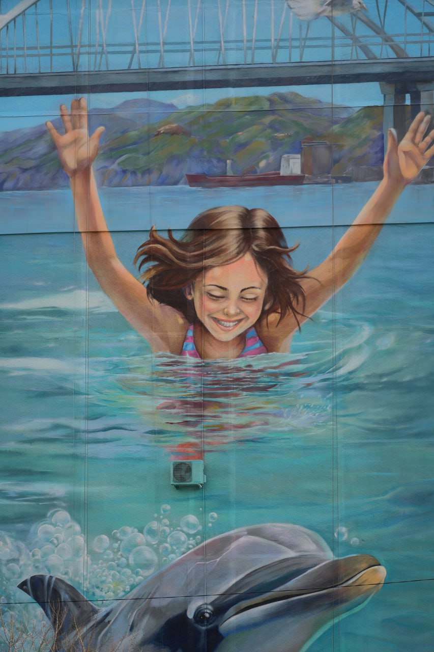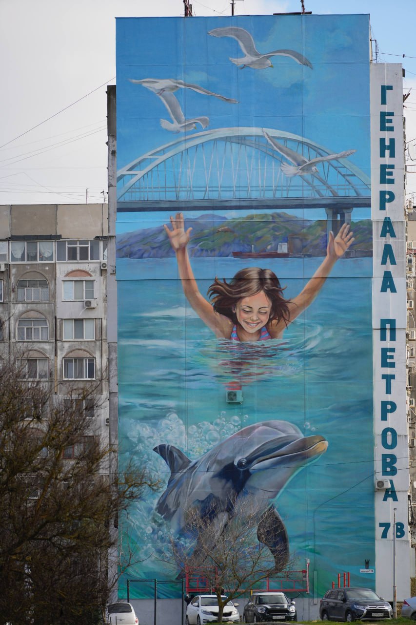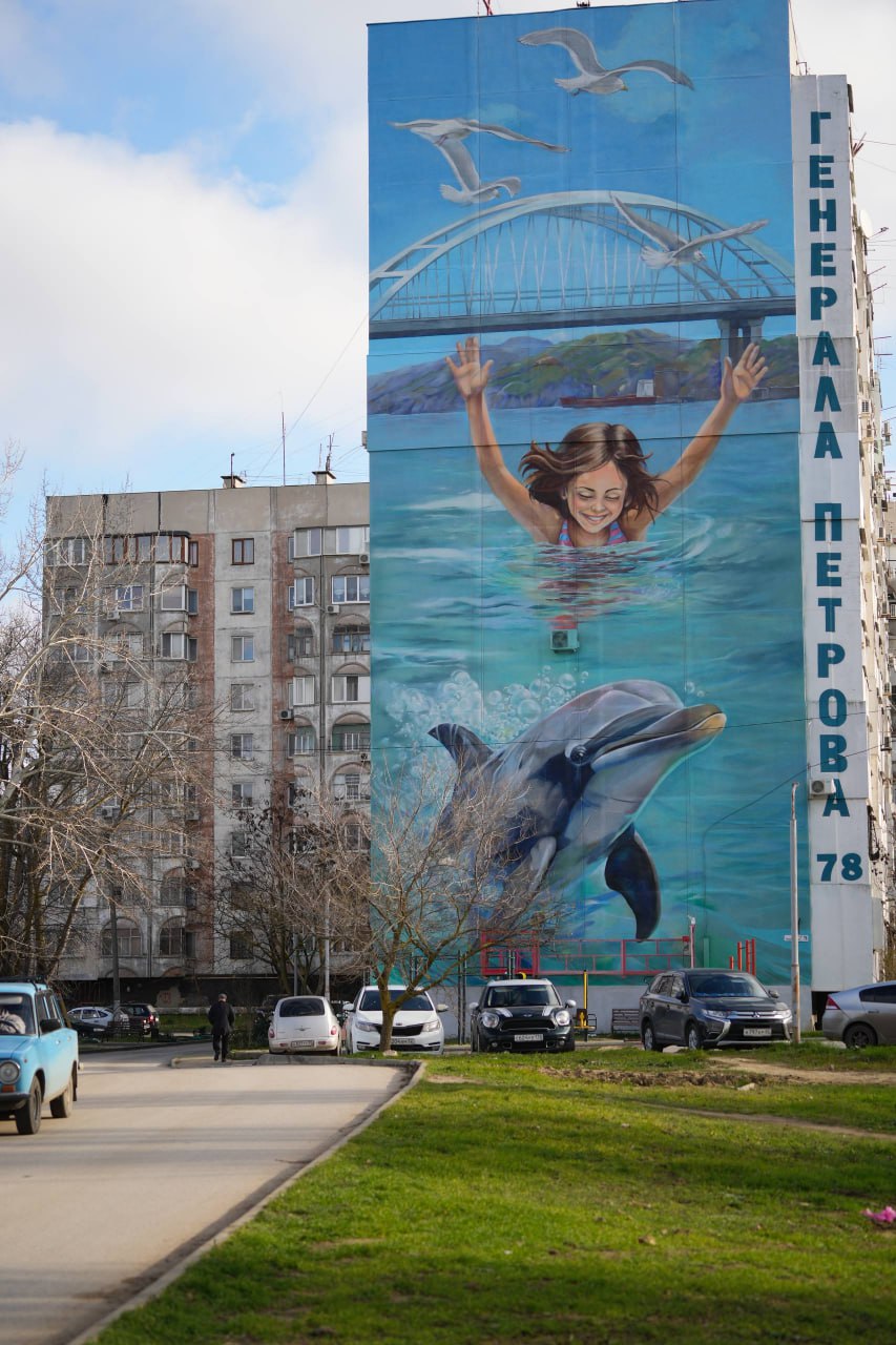 Художники с материка завершили работы над росписью многоэтажки по ул. Генерала Петрова, 78. Теперь боковой фасад дома украшает мурал с изображением счастливого ребенка, купающегося в море в компании дельфина на фоне очертаний Керчи и Крымского моста — ключевых символов города и региона.