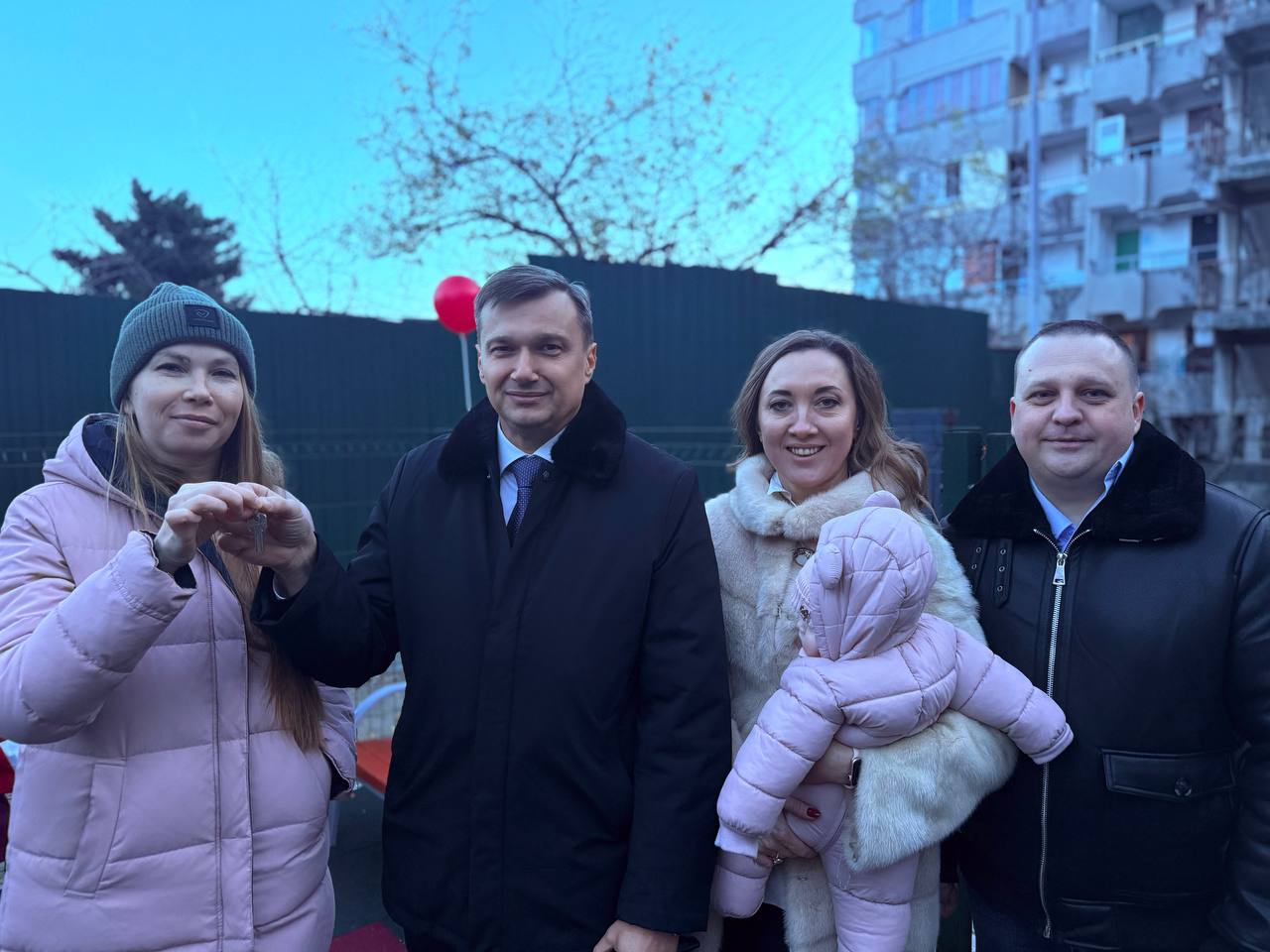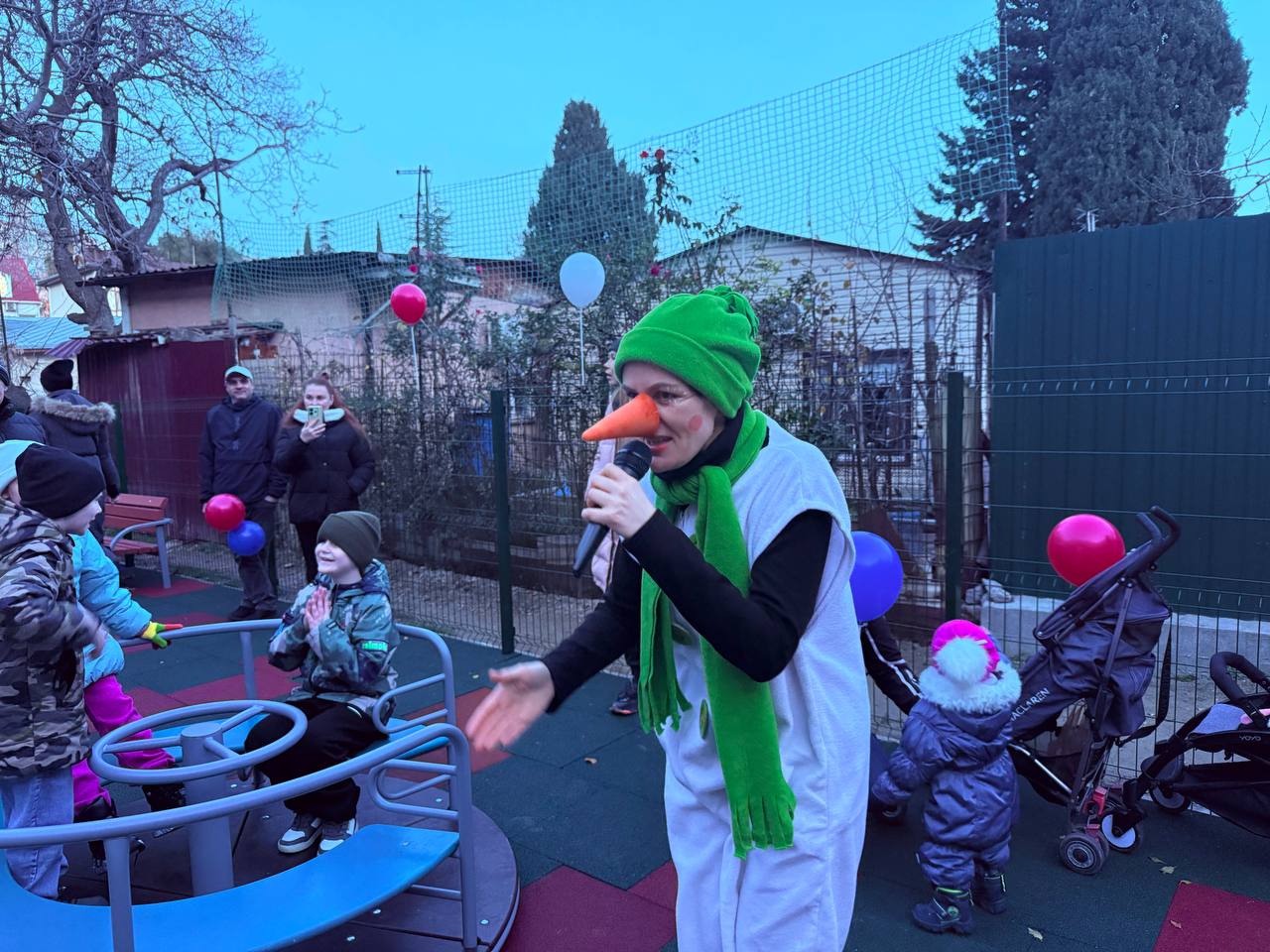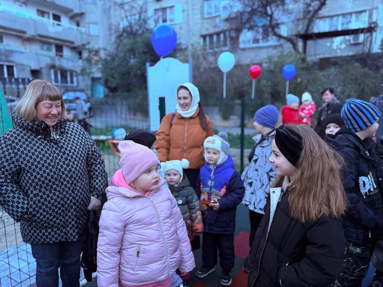 Для ребят организована игровая программа с участием сказочных персонажей. Всем детям вручили сладких Дедов Морозов. Ключи от площадки передали старшей по дому.