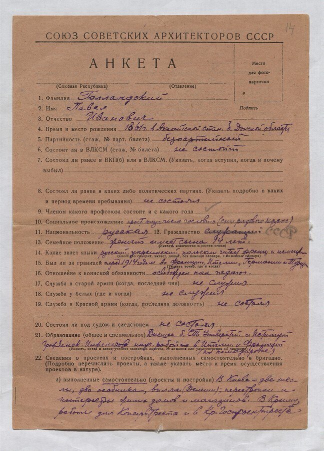 Анкета члена Союза советских архитекторов датируется 1938 годом, заполнена рукой П.И. Голландского и содержит его подпись. В документе указаны основные факты из биографии архитектора. Павел Иванович родился 14 декабря (26 декабря по новому стилю) 1861 года в станице Аксайской Донской области (ныне Ростовская область). Происходил из казачьего сословия, был сыном унтер-офицера казачьего полка. Образование получил в Новочеркасской классической гимназии. В 1892 году окончил петербургский Институт гражданских инженеров в звании гражданского инженера. Работал в Петербурге, затем в Киеве в Управлении архитектуры Юго-Западных железных дорог. Интересны сведения из анкеты о владении несколькими языками. В документе также указаны сведения о проектах, выполненных Павлом Ивановичем: «В Киеве две школы, два особняка, вилла, перестройки и интерьеры жилых домов и магазинов». В 1919 году переехал в Севастополь. В 1923 году обосновался с семьей в Симферополе. Павел Голландский оставил глубокий след в судьбе нашего полуострова. Двадцать лет своей жизни он посвятил изучению и сохранению исторического и культурного наследия Крыма, работал научным сотрудником в Херсонесе, затем в Центральном музее Тавриды, занимался преподавательской и научной деятельностью. Службу он совмещал с работой в Крымском областном комитете по делам музеев и охране памятников искусства, истории, старины и народного быта (КрымОХРИС). С 18 ноября 1923 года П.И. Голландский был также членом Таврического общества истории, археологии и этнографии (ТОИАЭ). Им была проделана огромная работа по охране, ремонту и реставрации памятников старины Крыма. С 1931 по сентябрь 1938 годы Голландский работал архитектором-проектировщиком в Крымгоспроекттресте. Им были созданы и реализованы проекты нескольких крупных зданий в Крымской столице – здание конторы «Заготзерно» по ул. Гоголя, 26 (сейчас «МАН» – Малая Академия наук) и Симферопольский колледж Национального университета пищевых технологий по ул. Гаспринского, 3.