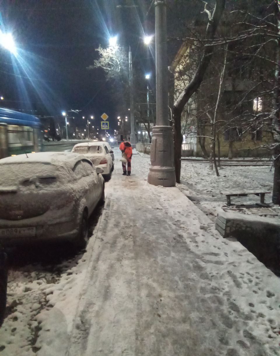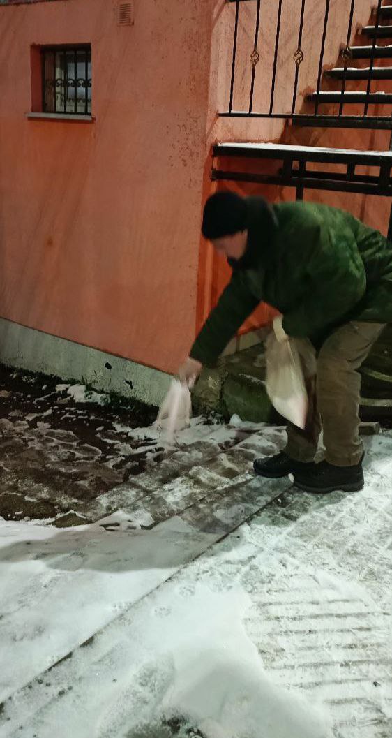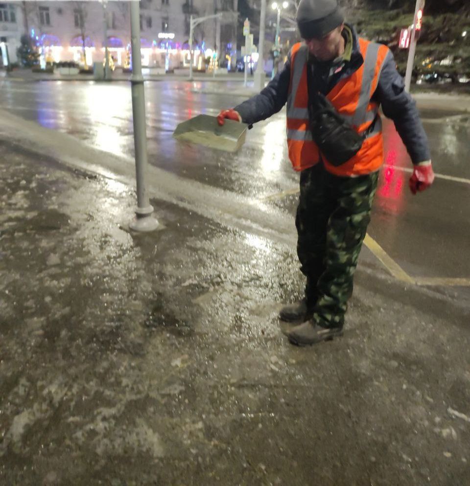 Сотрудники убирают снег и продолжают подсыпку пешеходных зон для безопасного передвижения.