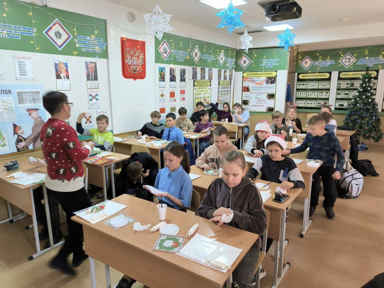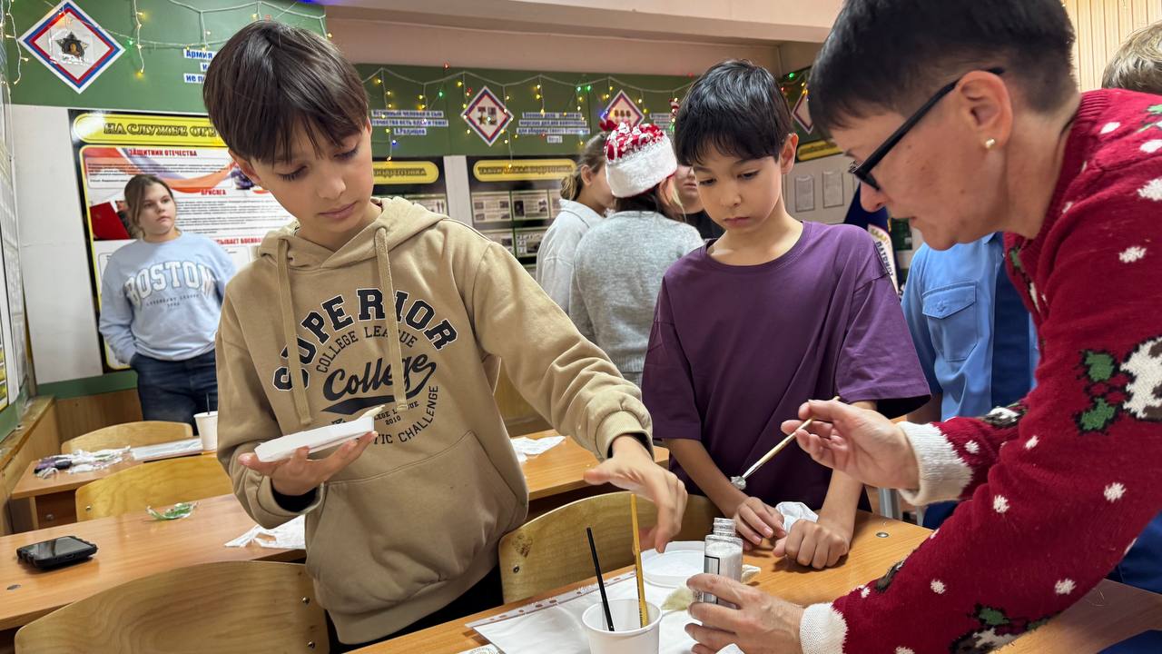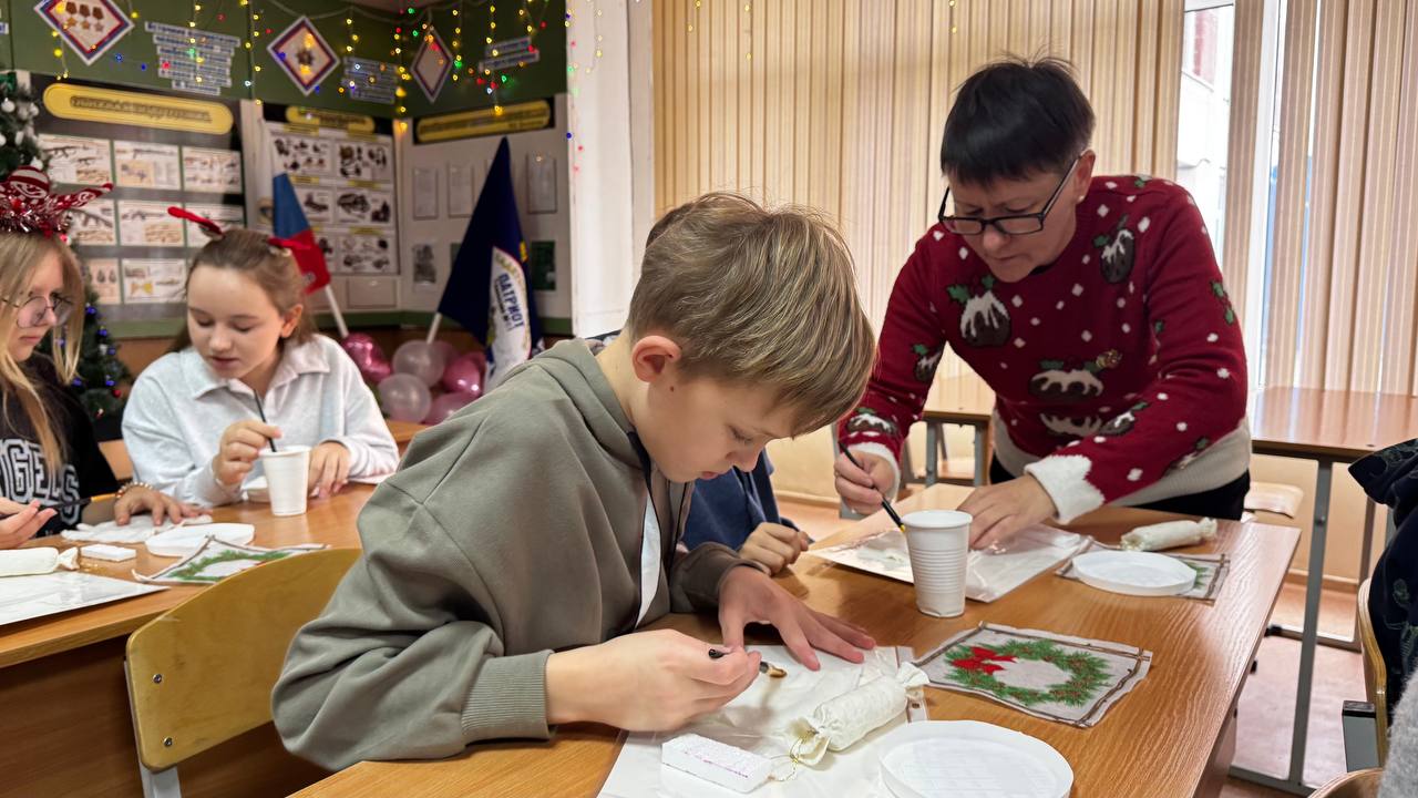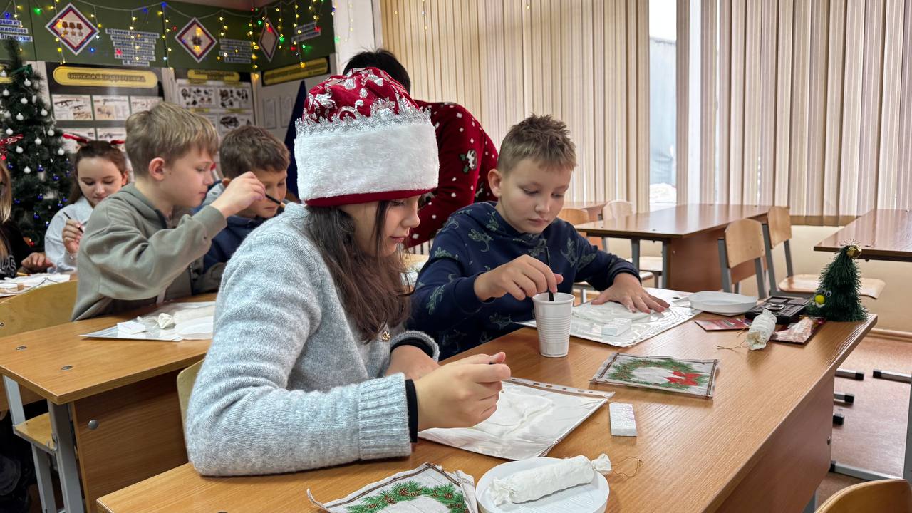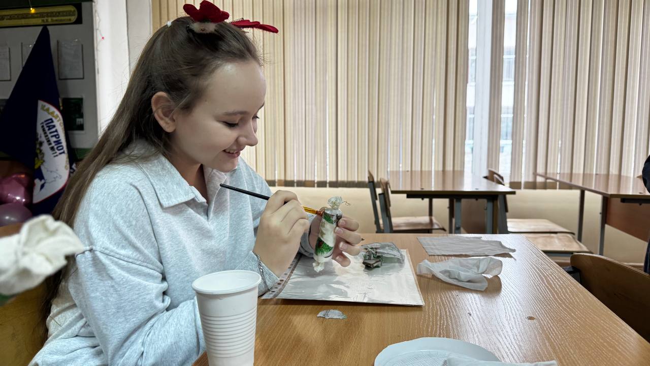 Сотрудники ГБУ РК «Дом дружбы народов» г. Симферополь — руководитель клубного формирования декоративно-прикладного творчества «Светлица» Ольга Николаевна Волокитина и режиссёр Денис Грабовец — провели для учеников 5-К класса увлекательный мастер-класс по изготовлению новогодних игрушек.