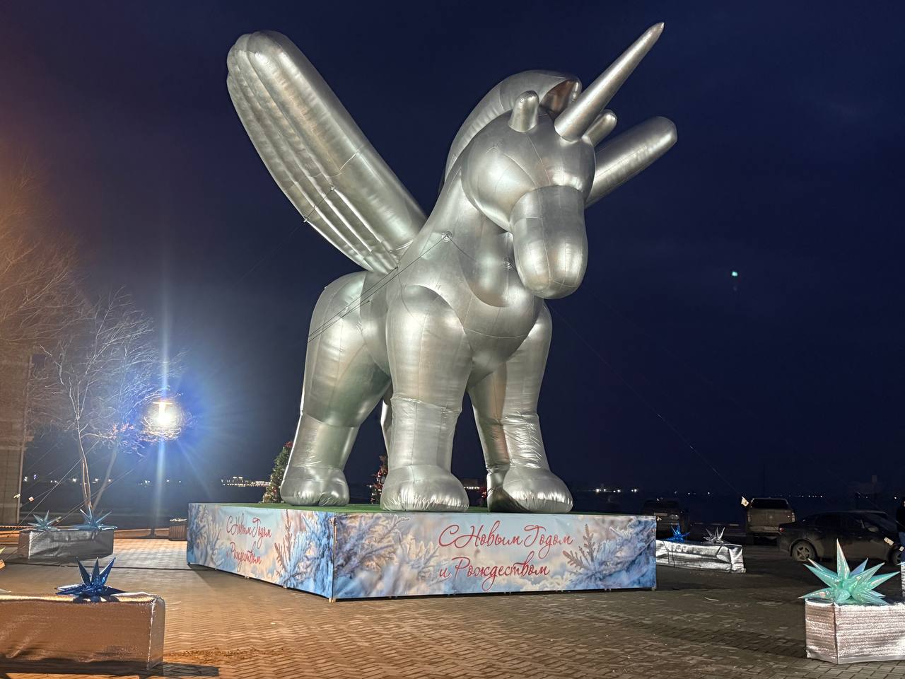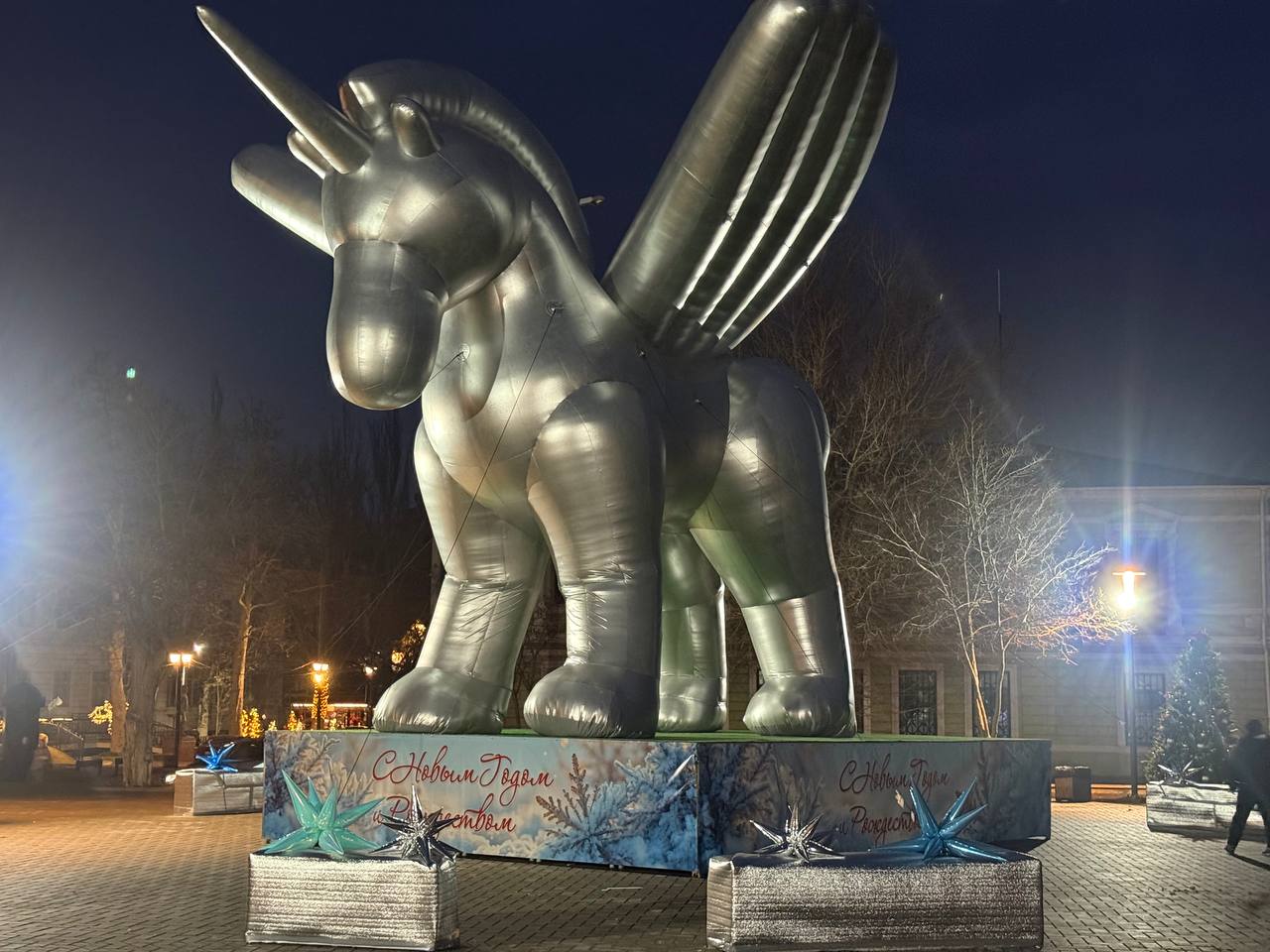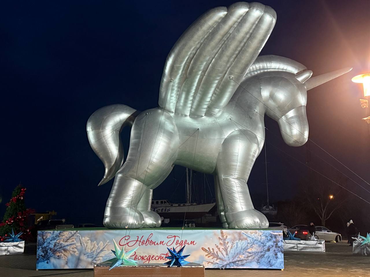 Также компанию им составила надувная фигура аликорна – мифического существа, которое сочетает в себе черты пегаса и единорога.