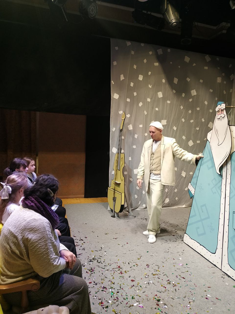 Музыкальная история предновогодней ночи — спектакль «Джаз-Мороз» по пьесе Ирины и Яна Златопольских — поразила ребят яркими световыми эффектами, пластикой сценических персонажей, прекрасным вокалом актёров и удивительными театральными превращениями, когда каждый предмет в руках мастеров-кукольников оживает и начинает действовать!
