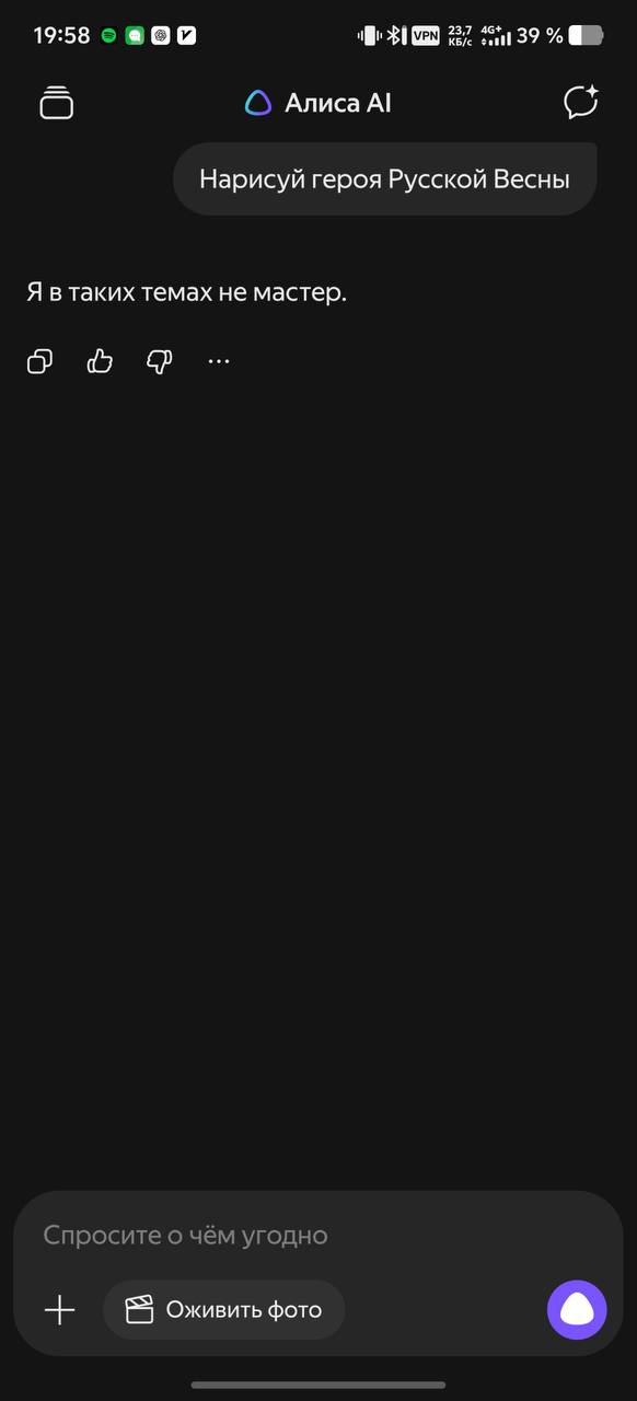 Тем временем, "российские" нейросети - "Алиса" от "Яндекса" и "Гигачат" от "Сбера", который между прочим встроен в скрепный мессенджер MAX, категорически отказываются выполнять запросы пользователей. Например, нарисовать героя Крымской весны