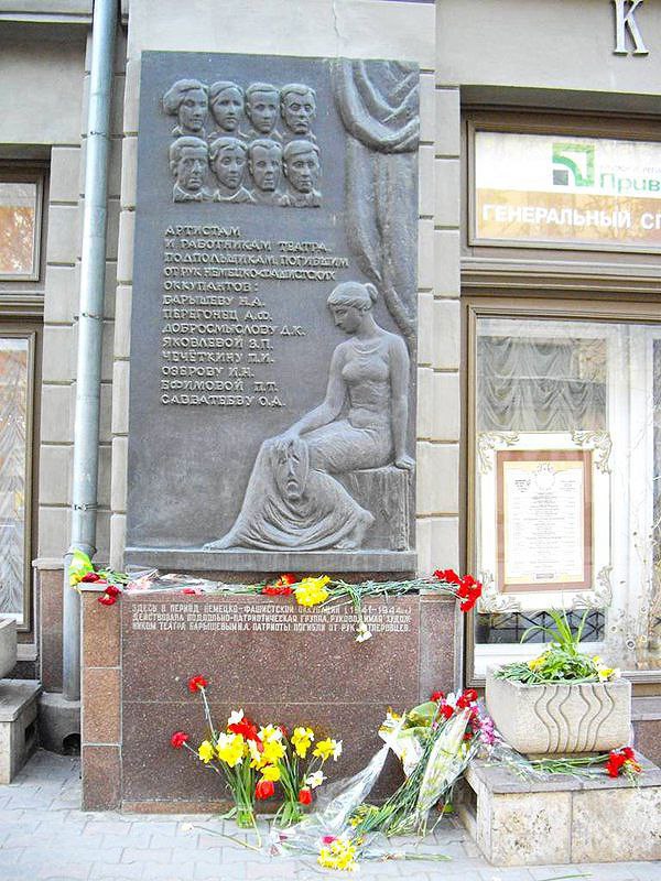 "Здесь во время нацистской оккупации с 1941 по 1944 год тайно действовала патриотическая группа, возглавляемая художником-декоратором театра Н. А. Барычевым. Эти патриоты были убиты нацистами. "