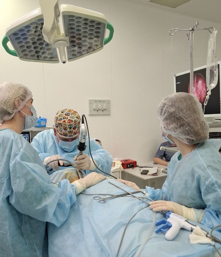 Во время операции была резецирована левая доля щитовидной железы с удалением большой доброкачественной опухоли переднего и заднего средостения. Вмешательство удалось выполнить малотравматичным доступом, без распила грудной кости. Под руководством торакального хирурга в операции участвовали также хирург-эндокринолог, кардиохирург, анестезиолог-реаниматолог, средний и младший медицинский персонал.