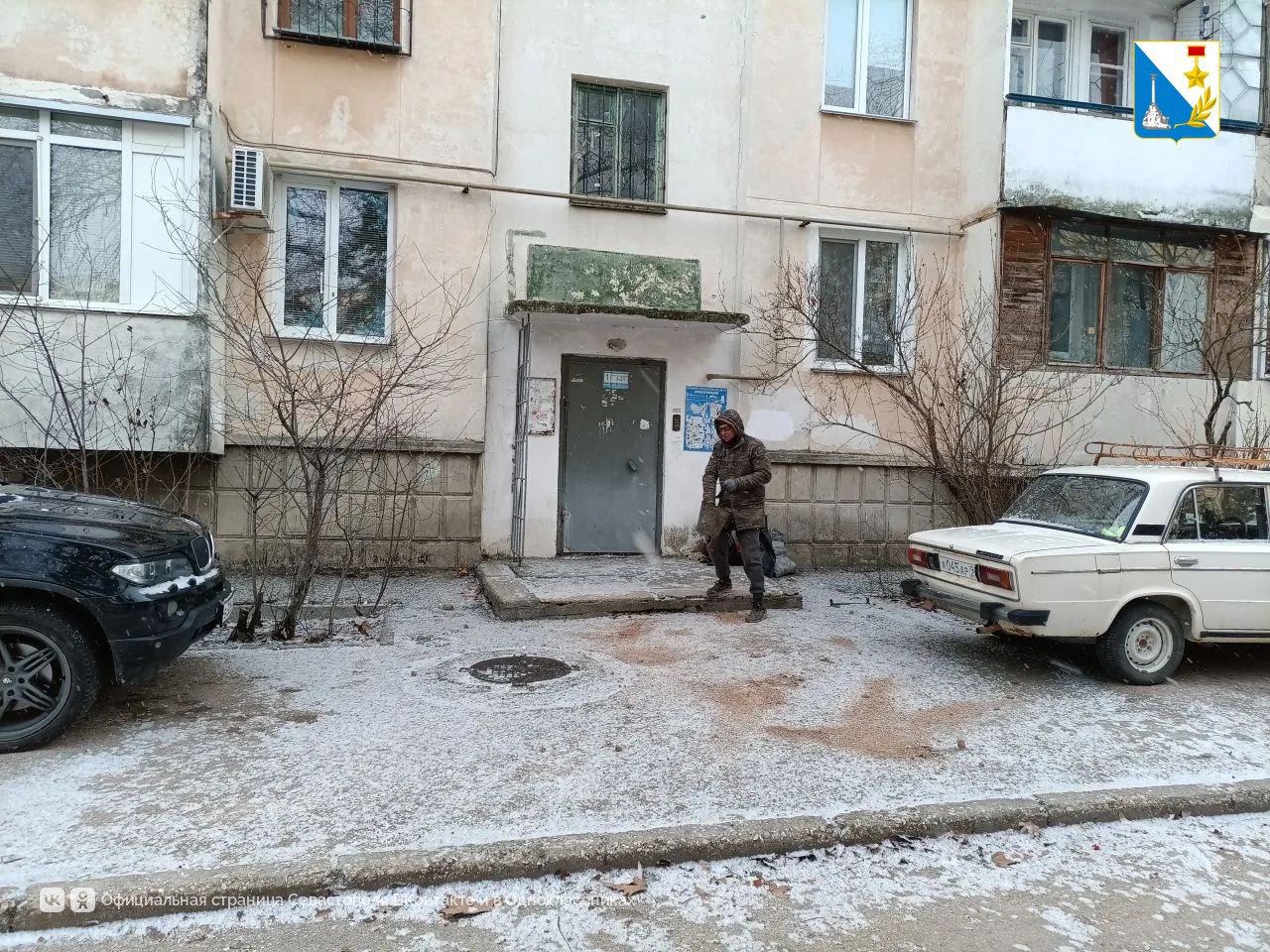 На фото — обработка территории у домов на улице Геловани, 6 и 8. Сотрудники городских служб работают в усиленном режиме и готовы оперативно реагировать.