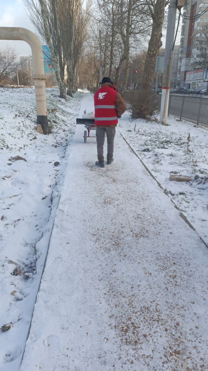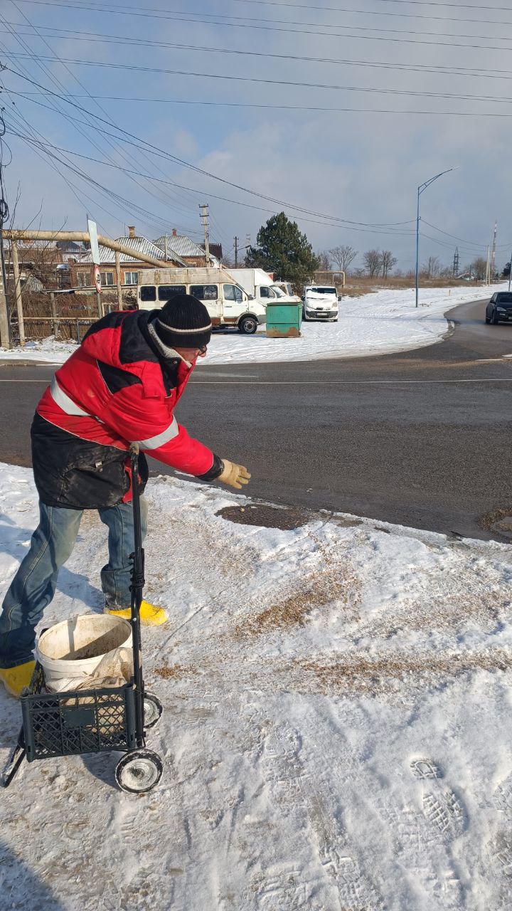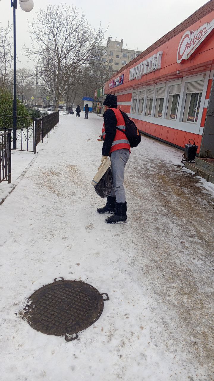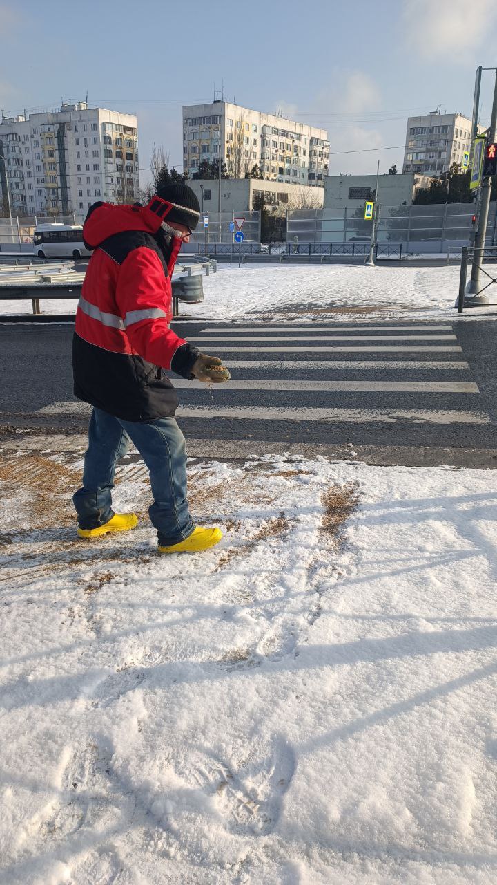 В течение всего дня в Керчи ведется обработка тротуаров на муниципальных территориях противогололедной смесью во всех микрорайонах города.