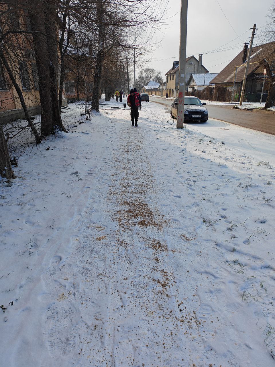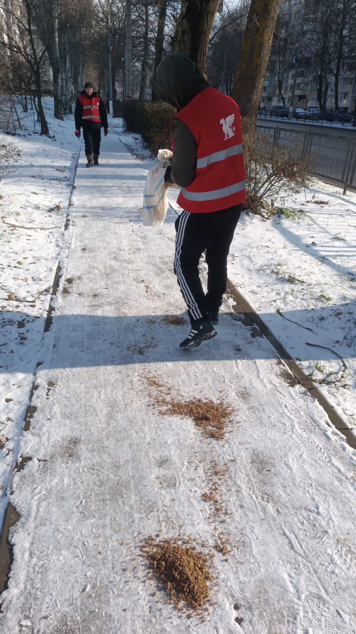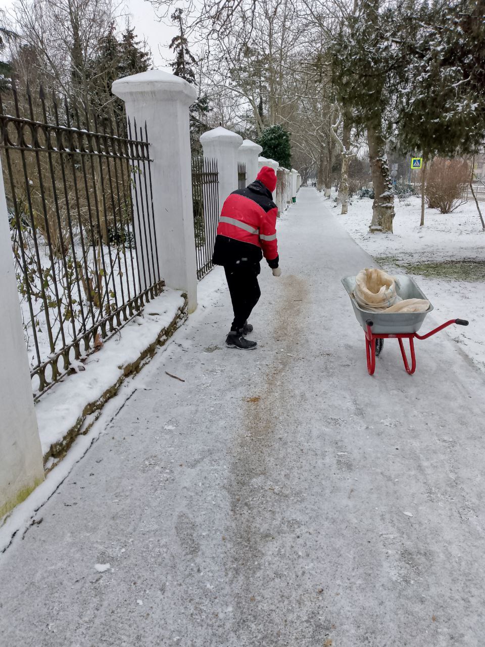 В течение всего дня в Керчи ведется обработка тротуаров на муниципальных территориях противогололедной смесью во всех микрорайонах города.