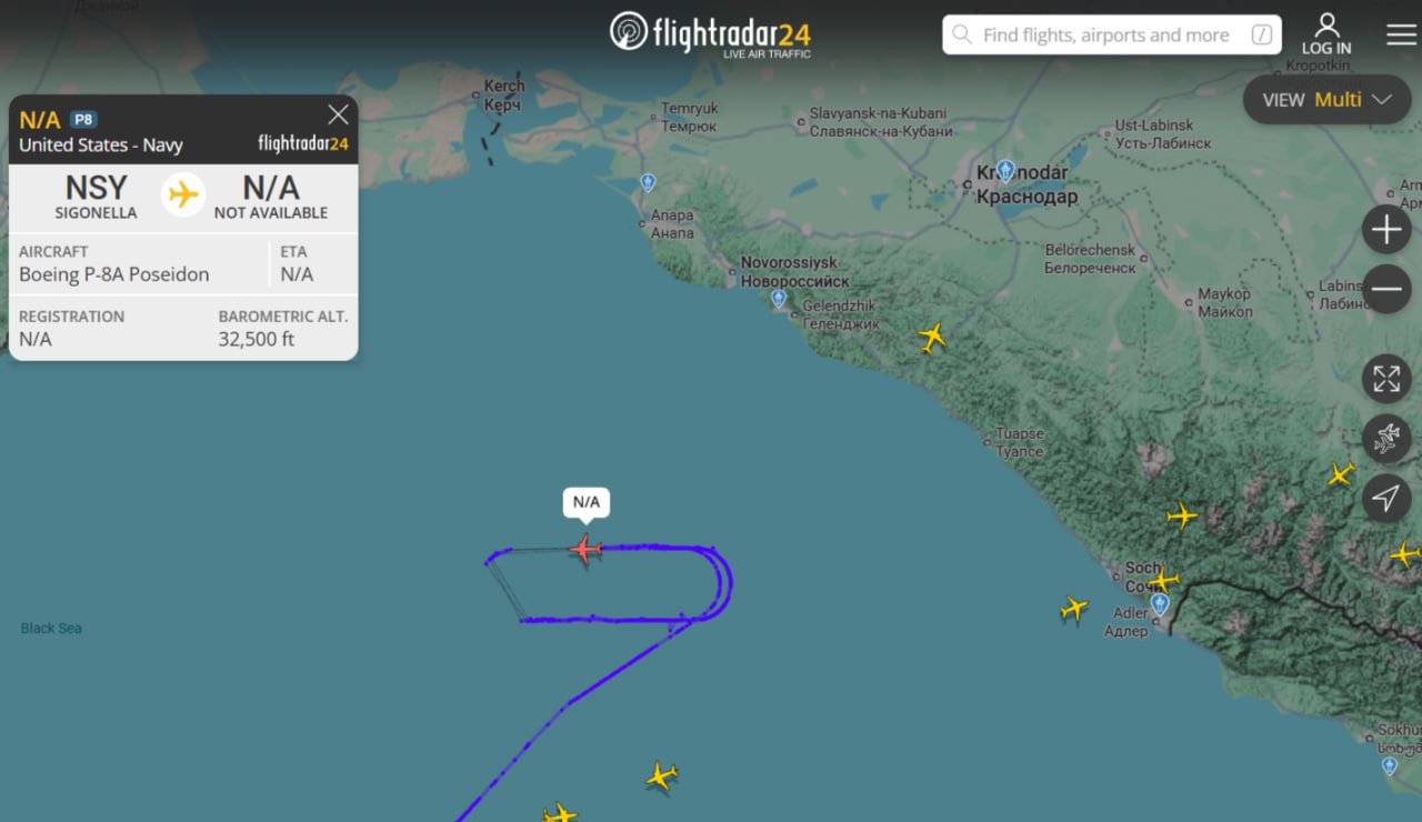 У берегов Крыма, Новороссийска и Сочи зафиксирован американский противолодочный самолёт. Боевые задачи по «патрулированию» в нейтральных водах выполняет Boeing P-8A Poseidon ВМС США. Также судно может собирать данные о радиолокационных и радиоэлектронных системах.
