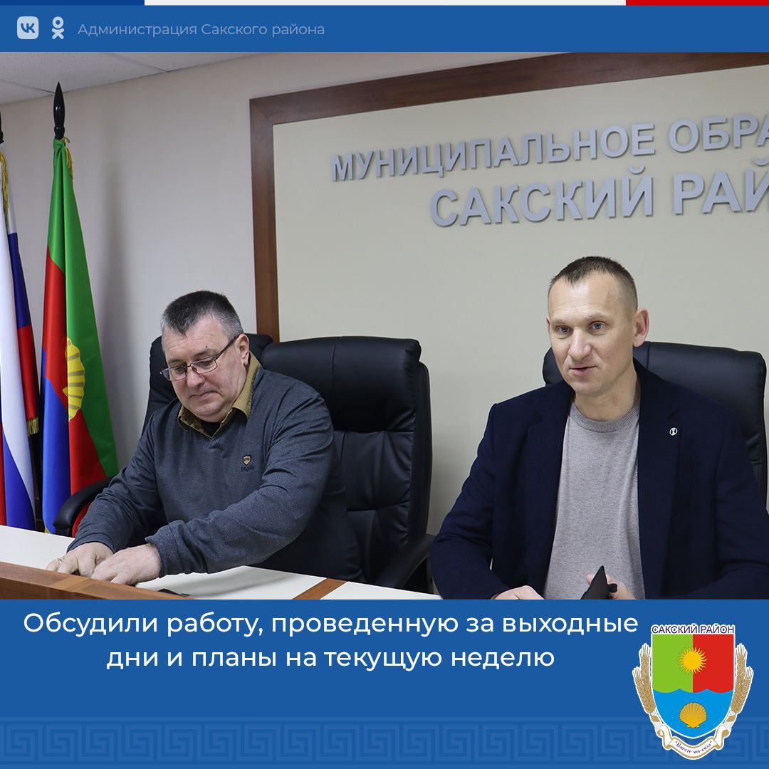 Понедельник. Первый заместитель главы администрации Сакского района Андрей Польченко и председатель Сакского районного совета Михаил Слободяник провели аппаратное совещание с начальниками структурных подразделений администрации, руководителями предприятий, учреждений района.Обсудили работу, проведенную за выходные дни и планы на текущую неделю.