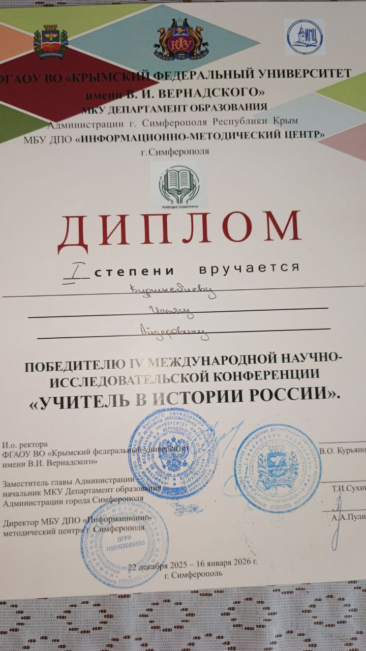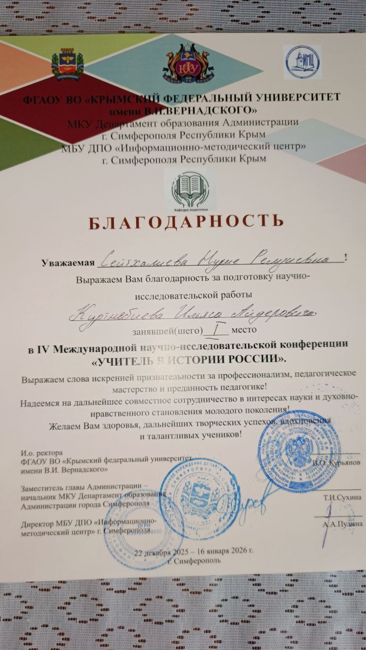 Ученик 7- А класса Червонновской средней школы Сакского района Куртнебиев Ильяс Айдерович под руководством учителя начальных классов Сейтхалиевой Нурие Ремзиевны стал победителем первого (заочного) этапа и прошёл в финал- на второй (очный) этап. Защита прошла на высоком уровне, была отмечена совместная работа ученика и руководителя. В финале Куртнебиев Ильяс Айдерович занял почётное 1 место и был награждён дипломом I степени. Научный руководитель победителя - Сейтхалиева Нурие Ремзиевна - была награждена благодарностью от администрации университета.
