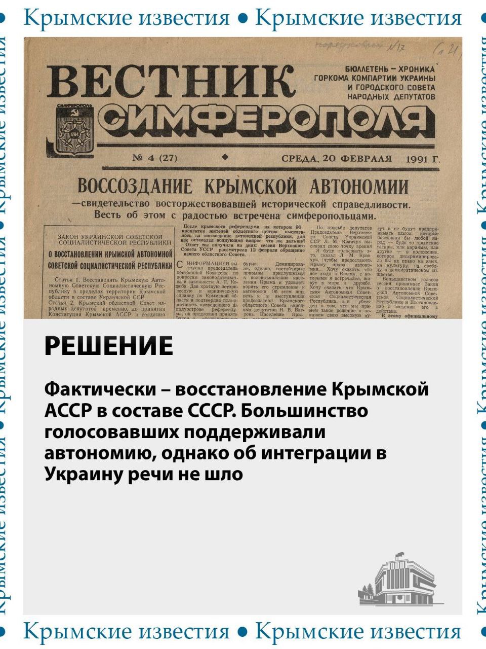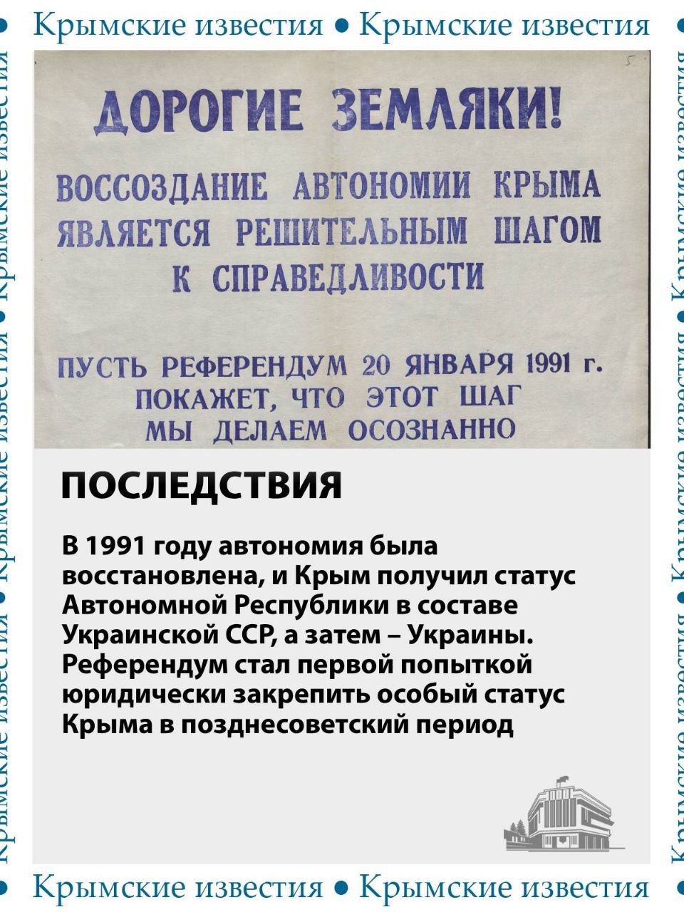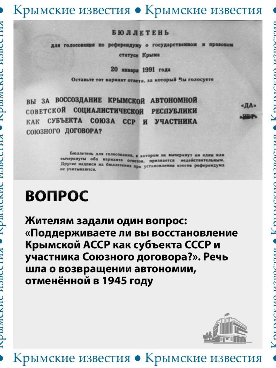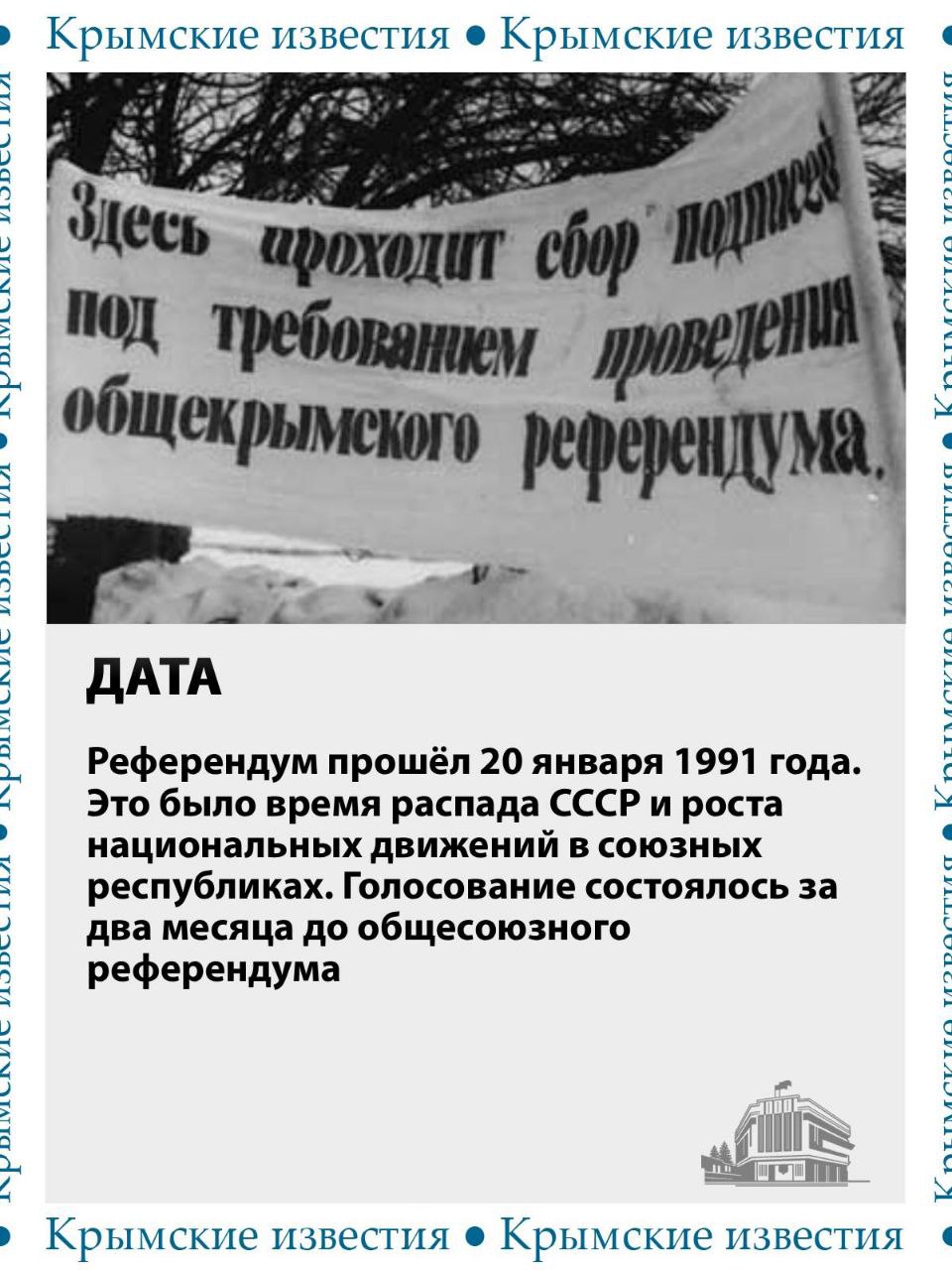 Дата приурочена к первому крымскому референдуму, который прошёл 35 лет назад. Что выбирали на всенародном голосовании, как всё проходило – смотрите в карточках