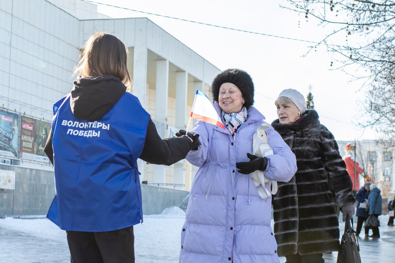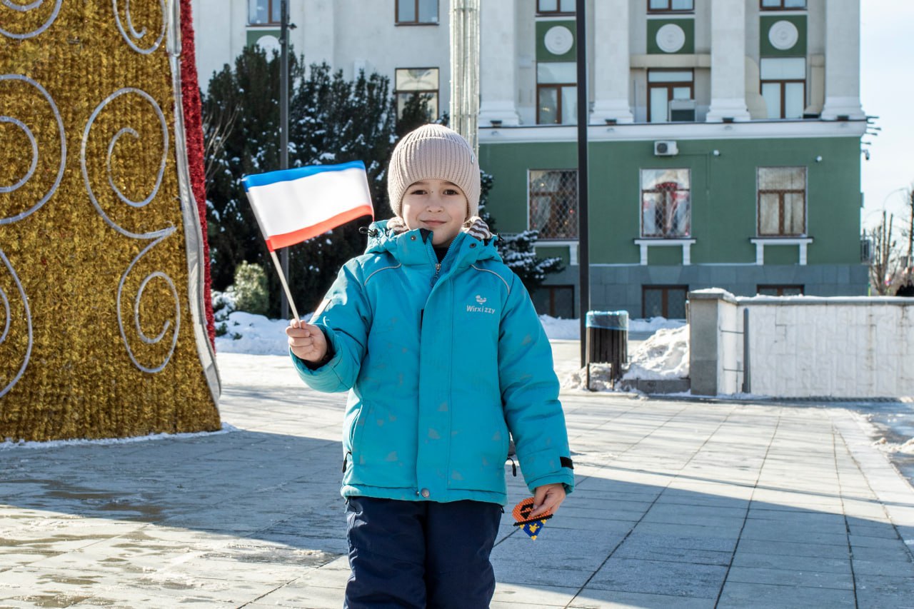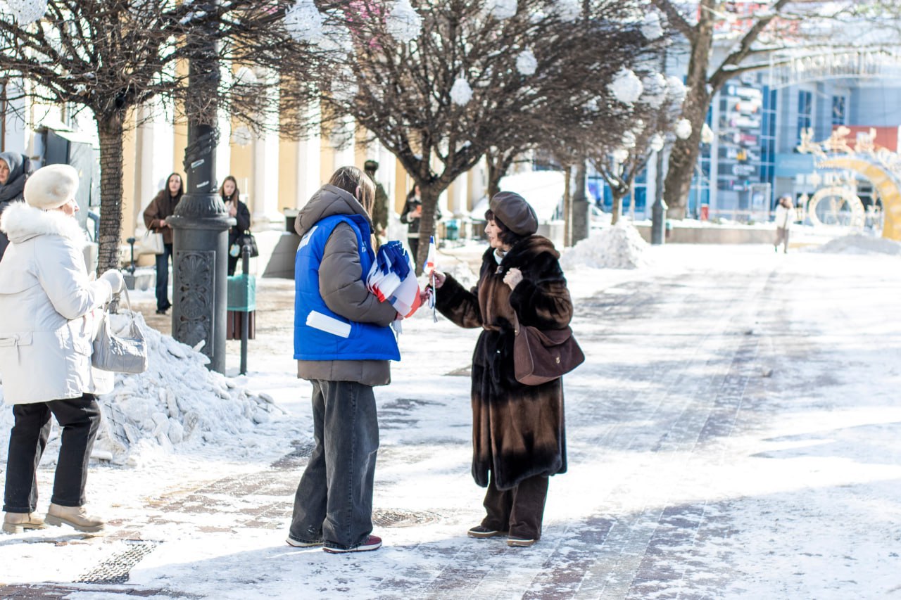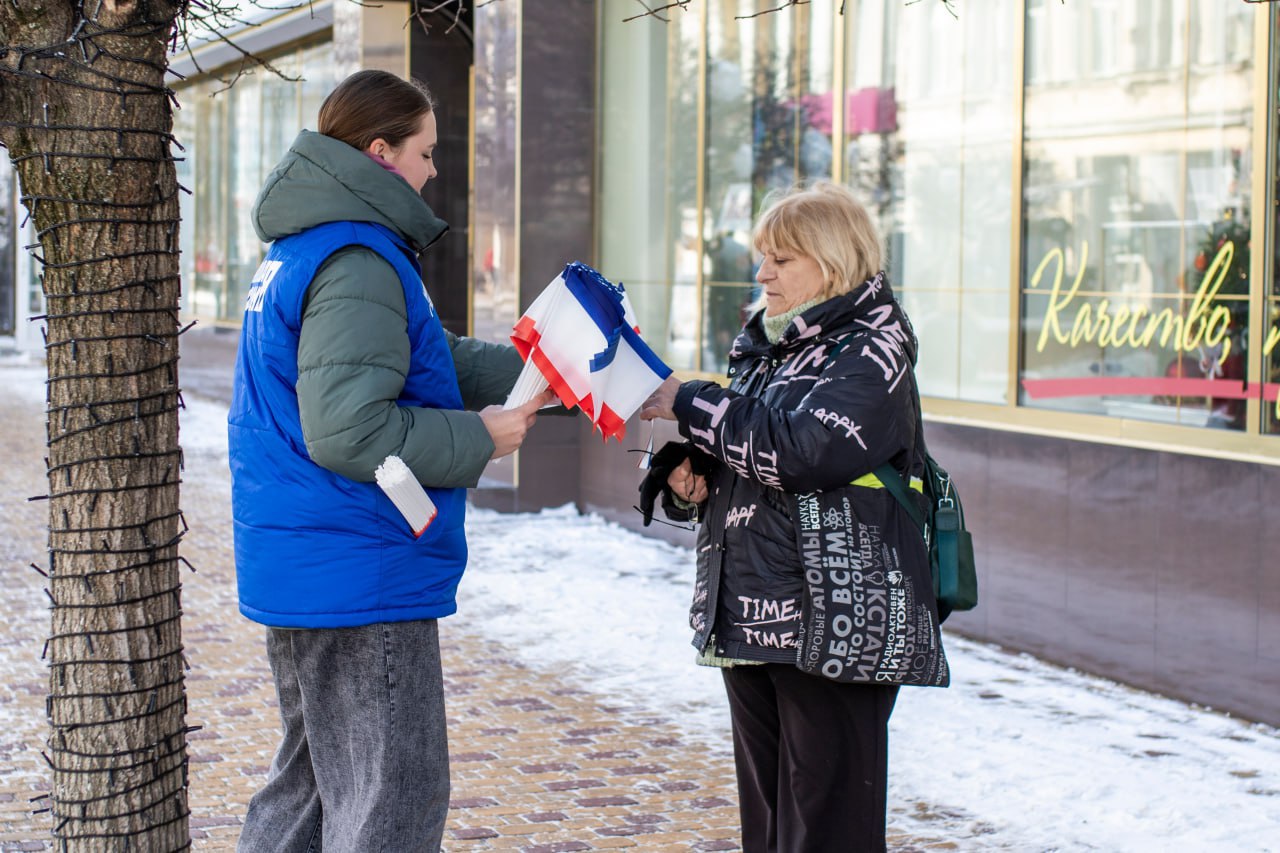 На центральных улицах Симферополя волонтёры раздали жителям и гостям города несколько сотен ленточек и флажков в цветах флага Республики Крым.
