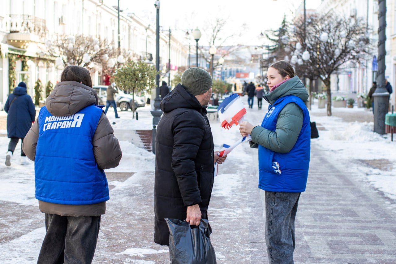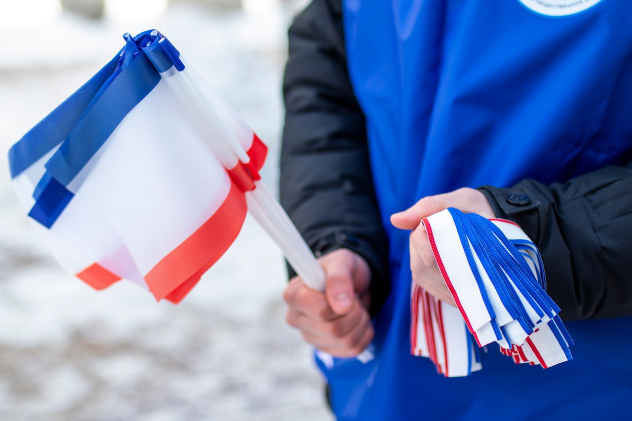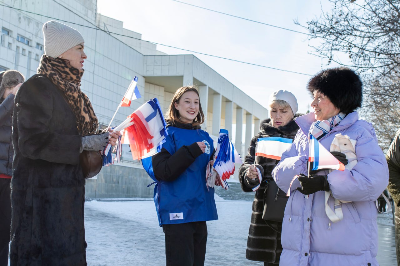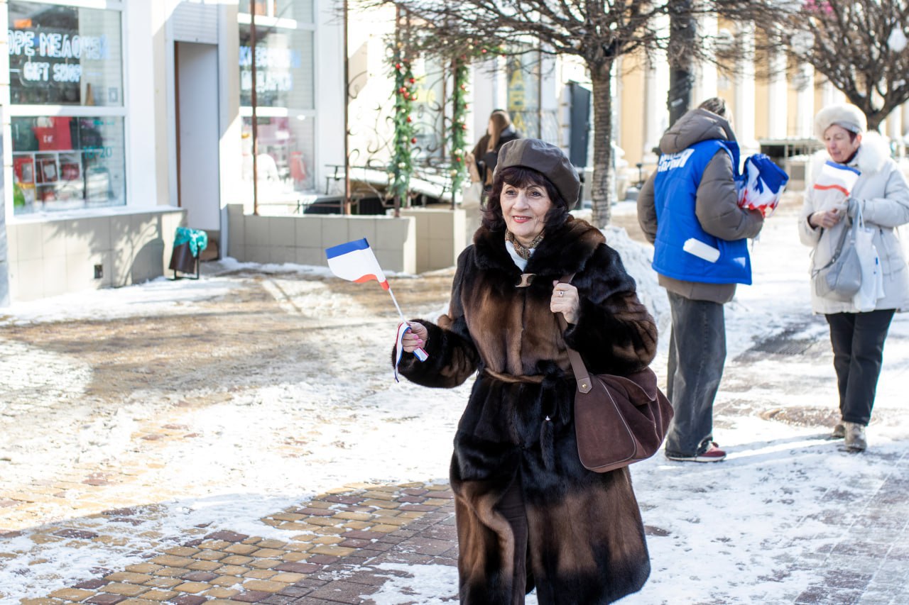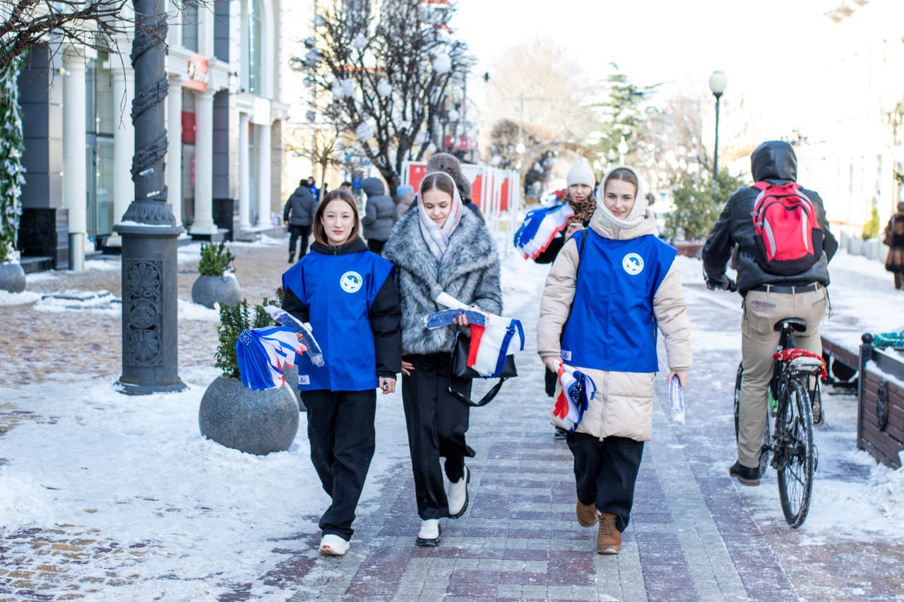 На центральных улицах Симферополя волонтёры раздали жителям и гостям города несколько сотен ленточек и флажков в цветах флага Республики Крым.