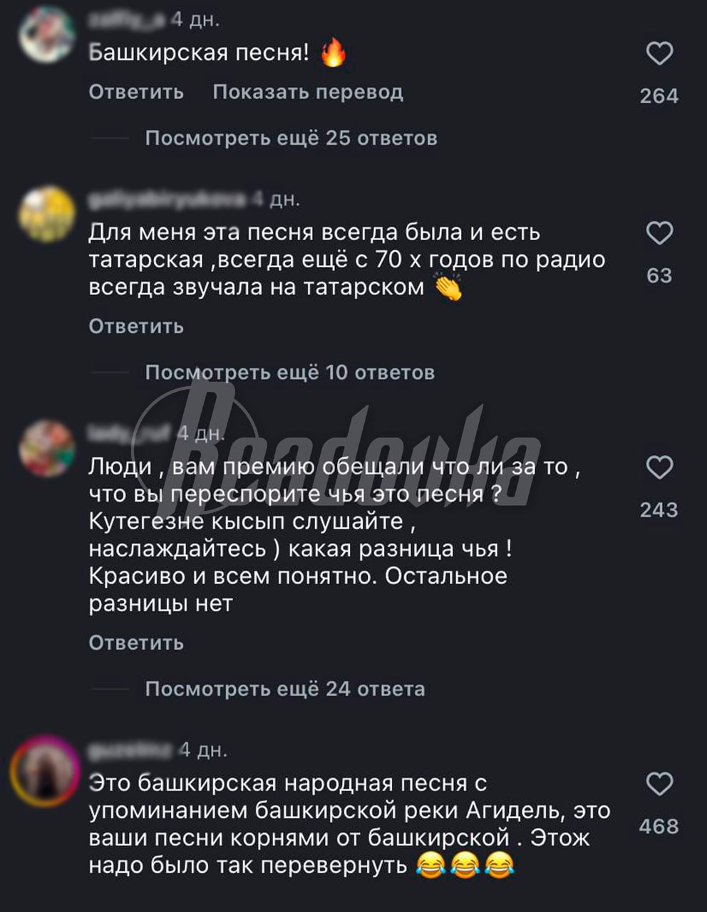 Третья часть недовольных выступила за татарское происхождение из-за большого количества перепевок на их языке и перевеса доли татар в Башкортостане. При этом крымский паблик приводит заявления музыковедов, которые утверждают «непривычную» манеру песни.