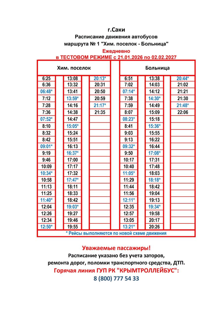 Обращаем Ваше внимание, что с 21 января по 2 февраля 2026 года , на основании многочисленных обращений граждан и для улучшения транспортной доступности, на автобусных маршрутах №1 "Химпоселок - Больница", №2 "Химпоселок - Ж/Д Вокзал" и №5 "Химпоселок - мкр. Амет-Хан-Султан" вводятся изменения в действующую схему движения.