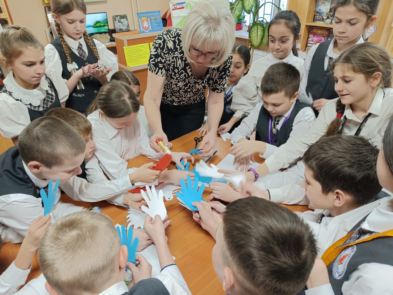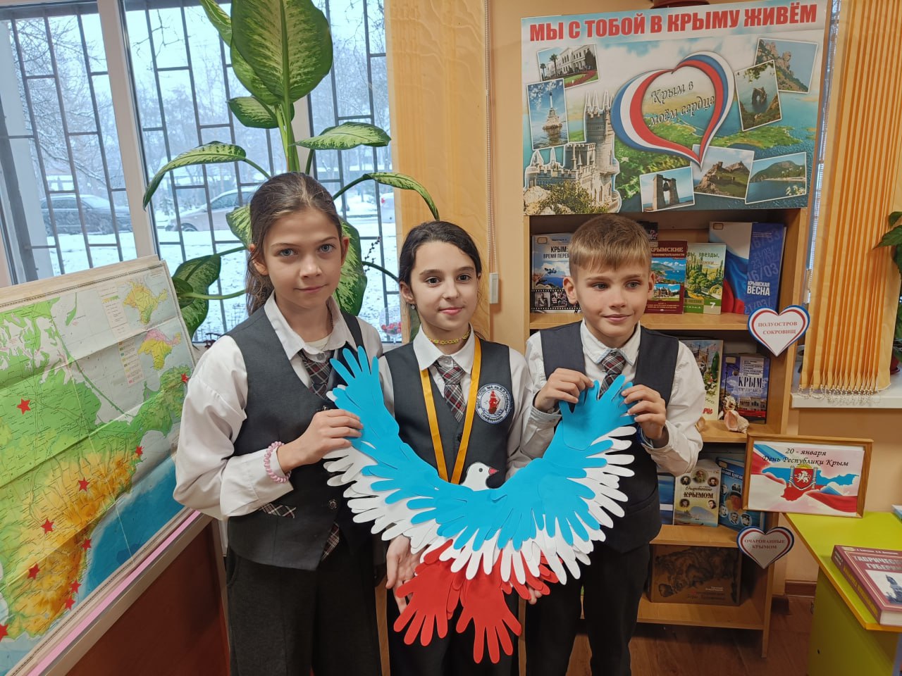 Ребята познакомились с историей праздника, узнали о значении государственных символов Республики Крым и совершили увлекательное путешествие по станциям «Краеведческая», «Географическая» и «Литературная», поучаствовали в викторине «Знаешь ли ты Крым?». Творческим завершением встречи стала арт-минутка по созданию символического «голубя мира» в цветах флага Республики Крым.
