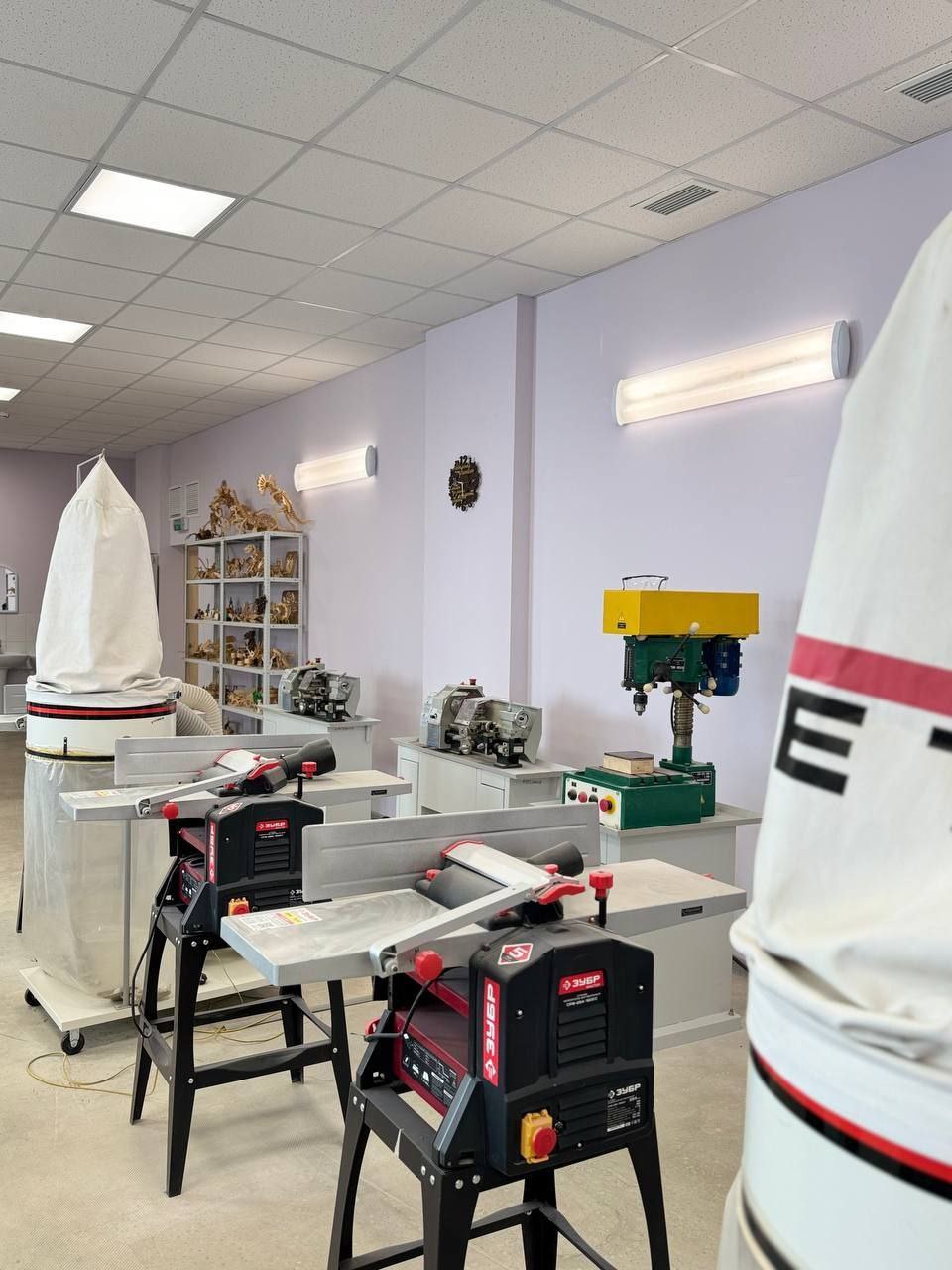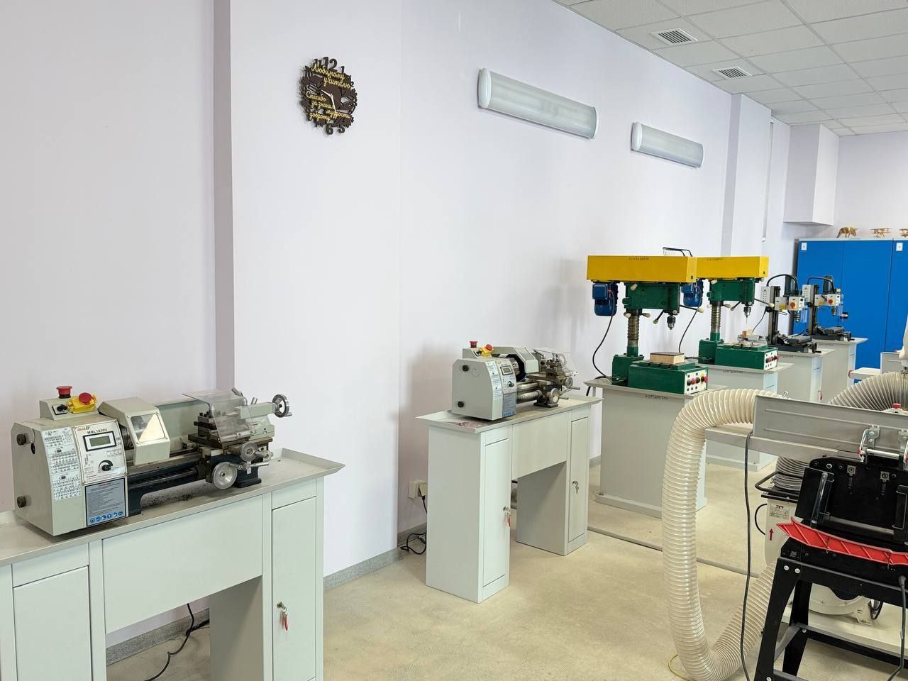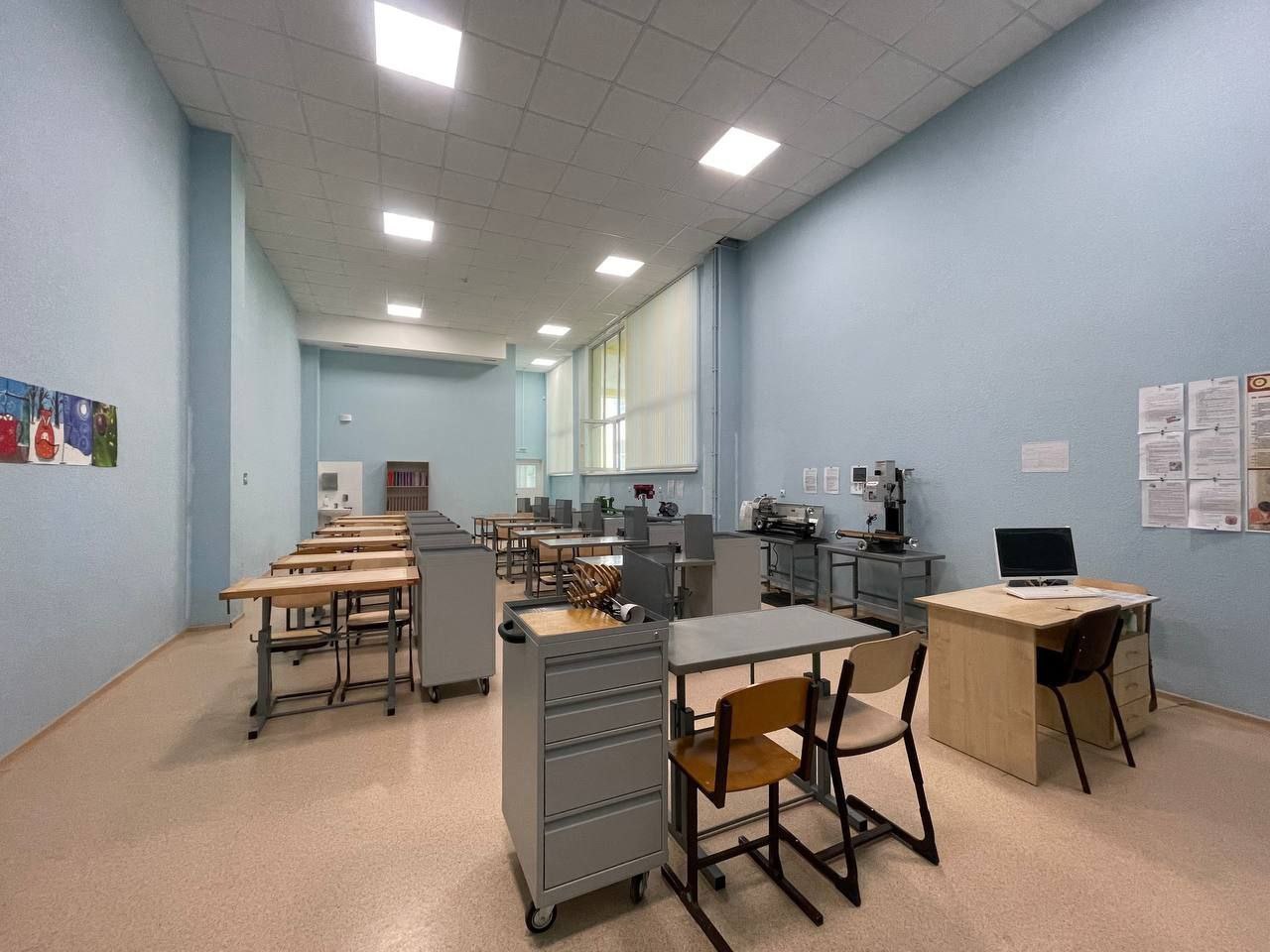 Для учебных кабинетов по предмету «Труд (технология)» приобретены: станки токарные деревообрабатывающие, вертикально-фрезерные станки, углошлифовальные машины, верстаки, шуруповерты, лобзики, приборы для выжигания, миксеры, утюги, швейные машины, электрические плиты.