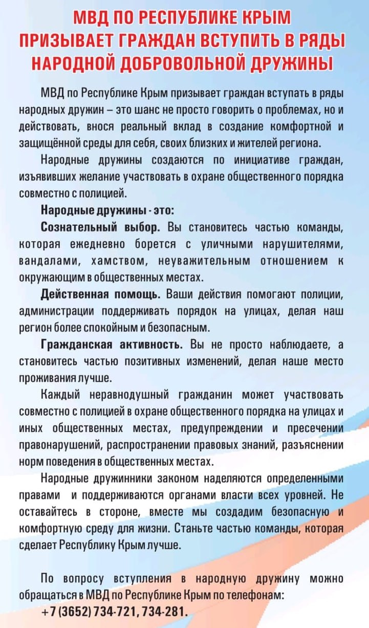 По вопросу вступления в народную дружину можно обращаться в ОМВД России по Белогорскому району по телефону: +7978-598-00-02; +7978-921-88-14