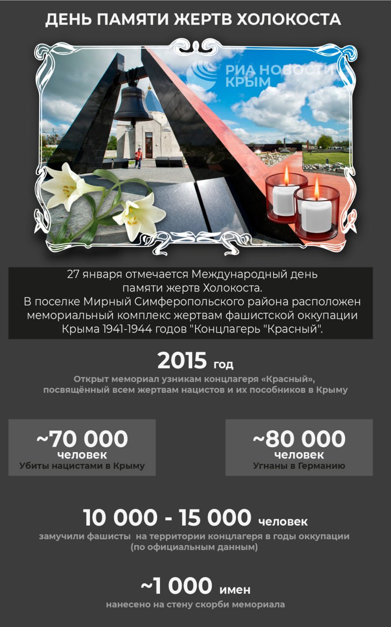 На полуострове нацисты создавали несколько десятков лагерей, тюрем, фильтрационных и исправительных лагерей. Самым страшным из них был концлагерь, организованный на месте советского птицеводческого совхоза "Красный".