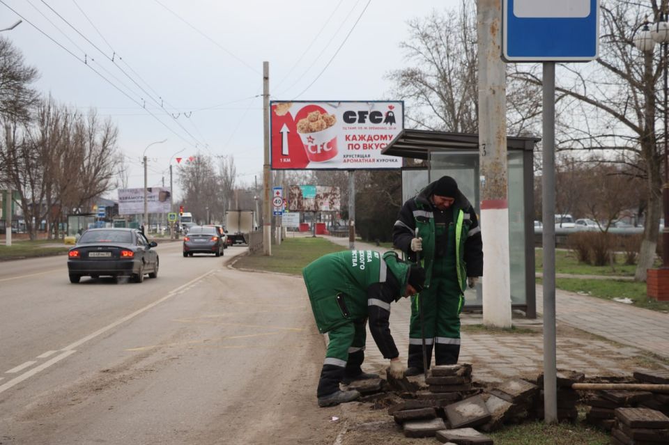 У остановки «Горбольница» по Вокзальному шоссе сотрудники Службы городского хозяйства проводят работы по восстановлению плитки.