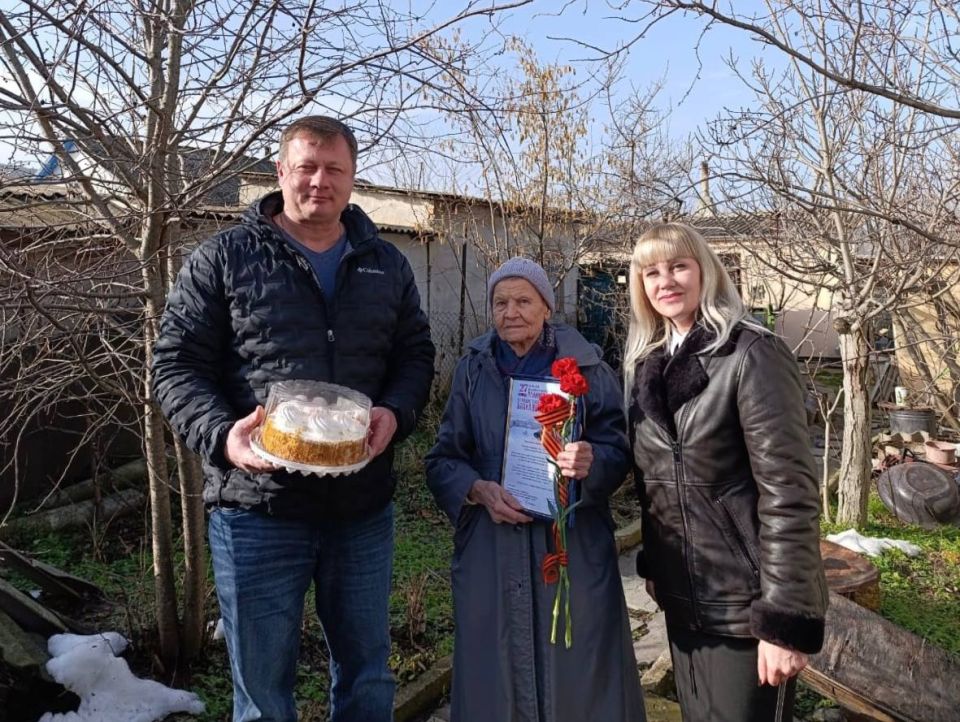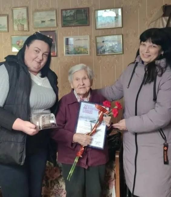 Милания Александровна Веселова с начальником территориального отдела пгт Орджоникидзе Ольгой Ивановной Белозеровой поздравили Людмилу Владимировну Губанову. Вручили памятный адрес, также пожелали здоровья, мирного неба над головой и всего самого доброго.