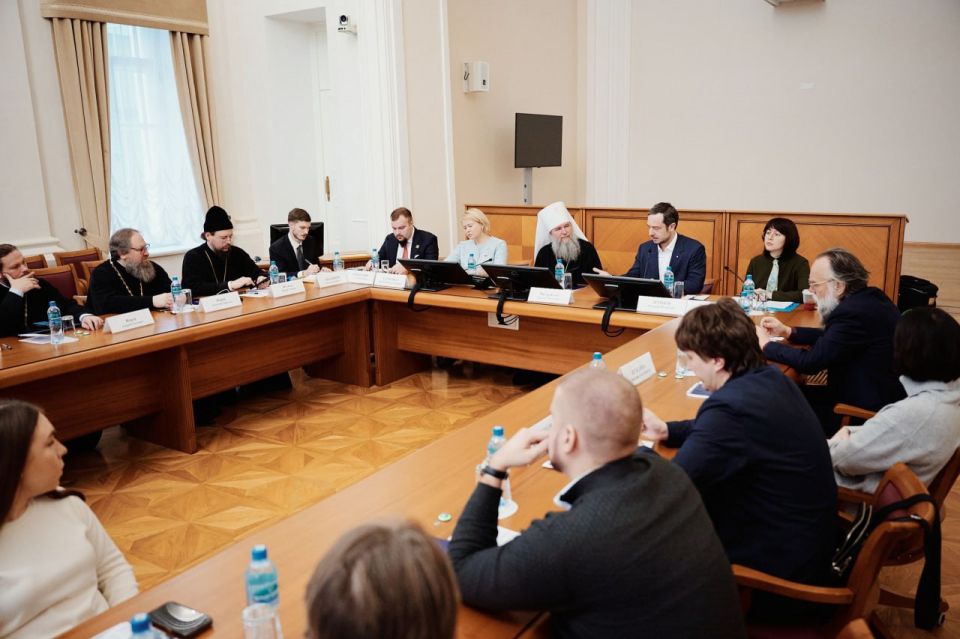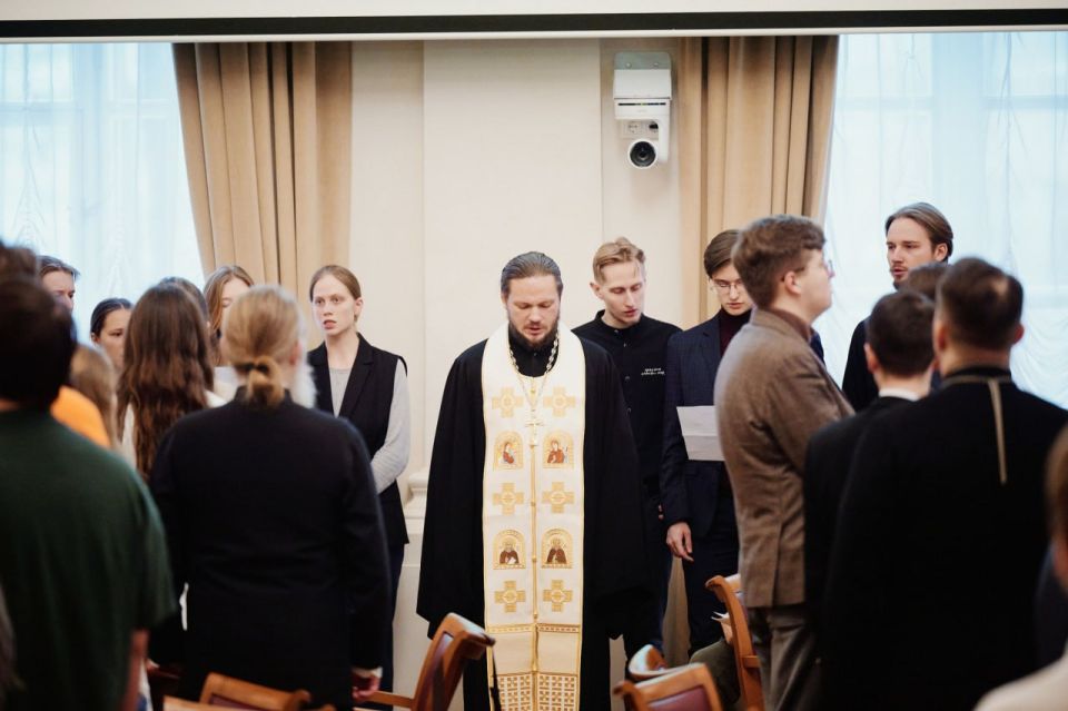 Перед началом заседания в зале ученого совета, располагающемся в помещении некогда бывшем домовой церковью св. блгв. кн. Александра Невского дома Дурасова был совершен молебен, песнопения которого исполнил студенческий хор Христианского клуба Высшей школы экономики.