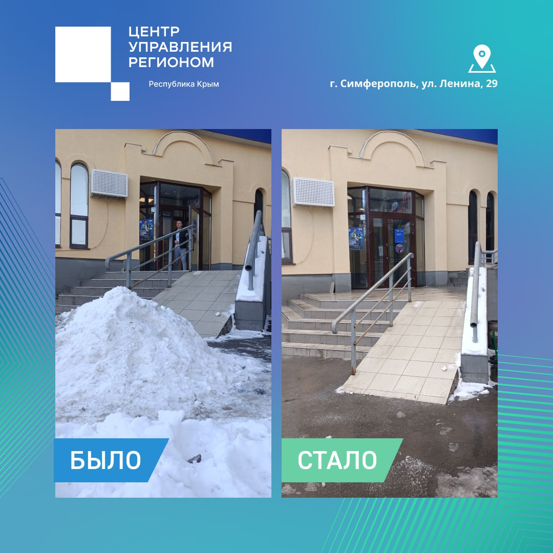 Житель Симферополя обратил внимание на то, что, очистив крыльцо от выпавшего снега, специалисты одного из учреждений, свалили его в большой сугроб прямо перед пандусом.